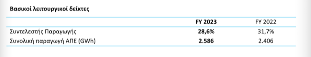 Όσον αφορά στον συντελεστή φόρτισης (load factor) αυτός διαμορφώθηκε σε 28,6% για το σύνολο του έτους έναντι 31,7% για το 2022, κυρίως λόγω των ανεμολογικών συνθηκών που επικράτησαν στην χώρα κατά το πρώτο μέρος του έτους, ενώ παρατηρήθηκε μια ομαλοποίηση τους κατά το δεύτερο μισό. Η στοχαστικότατα των ανεμολογικών συνθηκών είναι συμβατή με την παραγωγή αιολικής ενέργειας και λαμβάνεται υπόψιν σε κάθε μοντέλο πρόβλεψης, χωρίς να επηρεάζεται η μακροχρόνια απόδοση των έργων. Σε αυτό το πλαίσιο, η παραγωγή ενέργειας από ΑΠΕ κατά το 2023 ανήλθε σε 2.586 GWh σημειώνοντας αύξηση κατά 7,5% σε συνέχεια της λειτουργίας των νέων έργων από το δεύτερο μισό του έτους.