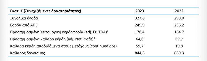 Τα συνολικά έσοδα από συνεχιζόμενες δραστηριότητες διαμορφώθηκαν σε 327,8 εκατ. ευρώ έναντι 298,0 εκατ. ευρώ το 2022. Τα έσοδα από πωλήσεις ΑΠΕ ανήλθαν σε 249,9 εκατ. ευρώ έναντι 236,2 εκατ. ευρώ σε συνέχεια των υψηλότερων πωλήσεων ενέργειας, ενώ τα έσοδα του τομέα ΣΔΙΤ/Παραχωρήσεων (διαχείριση απορριμμάτων και ηλεκτρονικό εισιτήριο) σε 31,4 εκατ. ευρώ έναντι 21,5 εκατ. ευρώ το προηγούμενο έτος. Τέλος η κατασκευαστική δραστηριότητα σημείωσε έσοδα 46,5 εκατ. ευρώ έναντι 40,3 εκατ. ευρώ για το 2022.