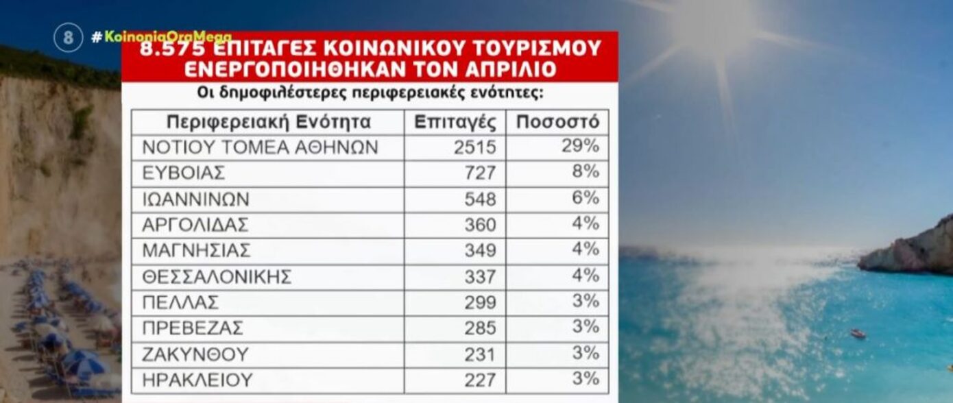 Τον περασμένο Απρίλιο ενεργοποιήθηκαν 8.575 επιταγές κοινωνικού τουρισμού, ενώ σύμφωνα με τα στοιχεία της Δημόσιας Υπηρεσίας Απασχόλησης, οι δικαιούχοι προτίμησαν ως προορισμούς τον Νότιο Τομέα Αθηνών, την Εύβοια αλλά και τα Ιωάννινα.