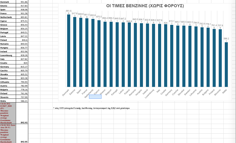 Λίγο καλύτερη είναι η εικόνα στη σχετική κατάταξη χωρίς τους φόρους, αλλά και πάλι η Ελλάδα ξεπερνάει πολλές χώρες στη σχετική λίστα. Βρίσκεται στην 7η θέση με την τιμή να διαμορφώνεται στα 0,85643 ευρώ το λίτρο, ενώ ο μέσος όρος στην Ευρωζώνη είναι 0,84295 ευρώ και στην Ε.Ε. των 27 είναι στα 0,84243 ευρώ. Αξιοσημείωτο είναι ότι η τιμή χωρίς τους φόρους στην Κύπρο είναι πιο ακριβή από ό,τι στην Ελλάδα, διαμορφούμενη στα 0,87551 ευρώ.
