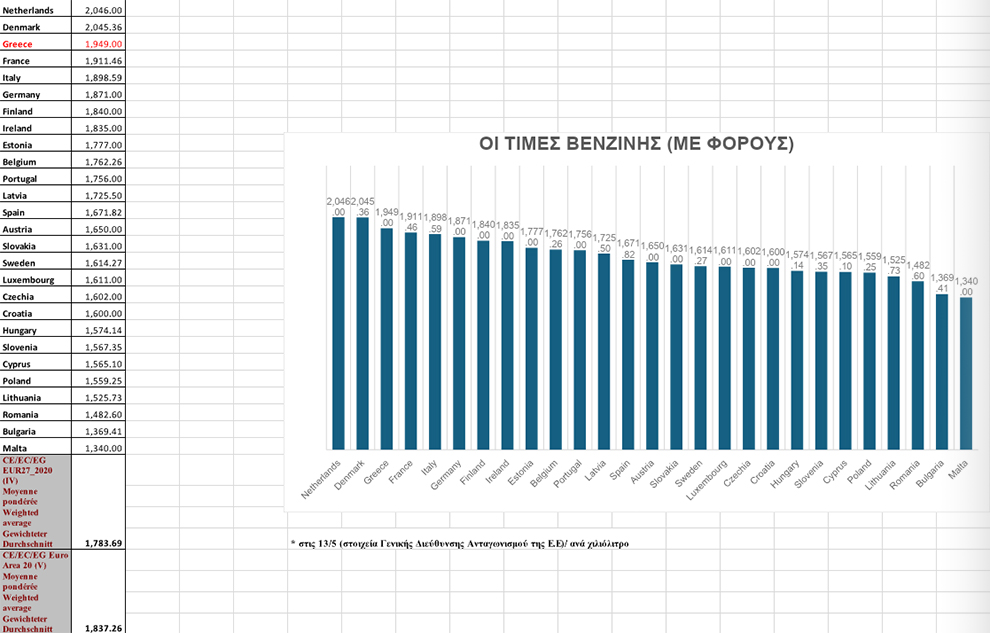 Όπως προκύπτει από τα στοιχεία της 13ης Μαΐου, η μέση τιμή στην Ελλάδα μαζί με τους φόρους διαμορφώνεται στα 1,949 ευρώ το λίτρο, ενώ ο μέσος όρος στην Ευρωζώνη είναι 1,837.26 ευρώ και στην Ε.Ε. των 27 είναι 1,783.29 ευρώ. Στην Ελλάδα, η βενζίνη των 95 οκτανίων πωλείται κατά 11,17 λεπτά ακριβότερα σε σχέση με τον μέσο όρο της Ευρωζώνης και κατά 16,57 λεπτά το λίτρο σε σχέση με τον μέσο όρο της Ε.Ε. των 27.