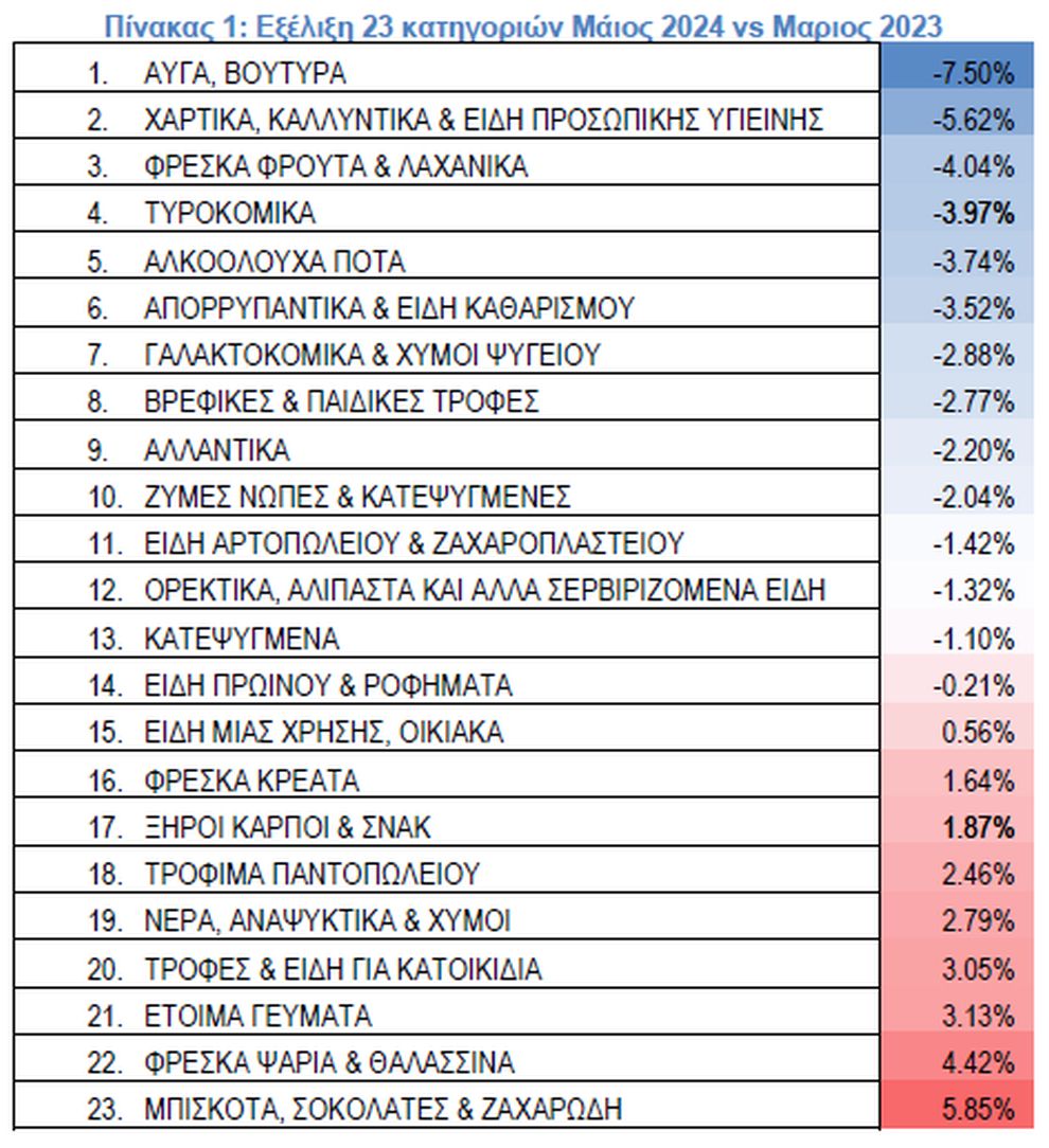 Μεγαλύτερες μειώσεις τιμών καταγράφονται στις κατηγορίες: βούτυρα και αυγά (-7,50%), χαρτικά, καλλυντικά και είδη προσωπικής υγιεινής (-5,62%), φρέσκα φρούτα και λαχανικά (-4,04%), τυροκομικά (-3,97%), αλκοολούχα ποτά (-3,74%). Στα γαλακτοκομικά, οι μειώσεις που καταγράφονται είναι αποτέλεσμα τόσο της ομαλοποίησης της αγοράς μετά την πανδημία και της μείωσης στις τιμές παραγωγού σε ορισμένα προϊόντα, ενώ προϊόντα όπως το βούτυρο και τα αυγά επωφελούνται από τις προωθητικές ενέργειες λόγω του Πάσχα. Τα φρέσκα φρούτα και λαχανικά έχουν ευνοηθεί από τις συγκριτικά καλύτερες καιρικές συνθήκες σε σχέση με το 2023.