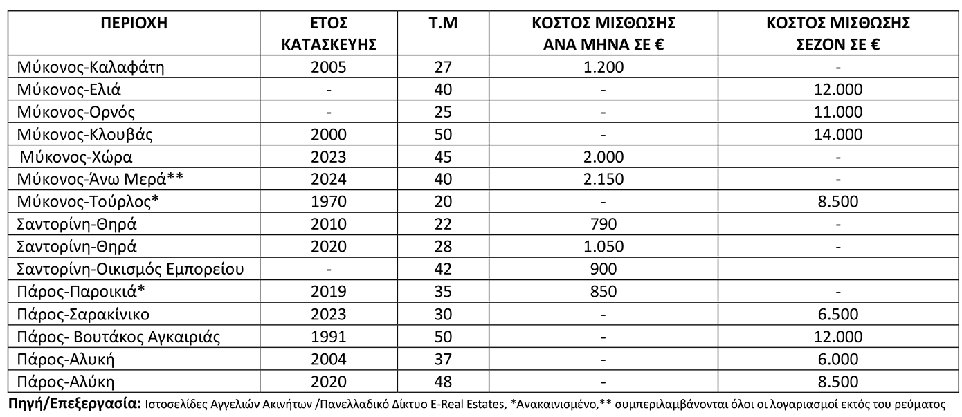Σύμφωνα με τις αναρτημένες αγγελίες ακινήτων σε ιστοσελίδες, το κόστος μίσθωσης κατοικίας 27τμ κατασκευής του 2005 στη περιοχή Καλαφάτη της Μυκόνου, μισθώνεται προς 1.200€/μήνα, χωρίς να περιλαμβάνεται το κόστος του ρεύματος, αλλά, μόνο το νερό και το internet. Στη περιοχή Κλουβάς της Μυκόνου, το κόστος μίσθωσης κατοικίας 50τμ αγγίζει τις 14.000€ για τη σεζόν ( Απρίλιος –Οκτώβριος). Παρόμοια εικόνα και στην Σαντορίνη, το κόστος μίσθωσης κατοικίας 28τμ του 2020, αγγίζει τα 1.050€/μήνα. Στην Πάρο, κατοικία 50τμ μισθώνεται για τη σεζόν προς 12.000€ στην περιοχή Βουτάκος Αγκαιριάς.