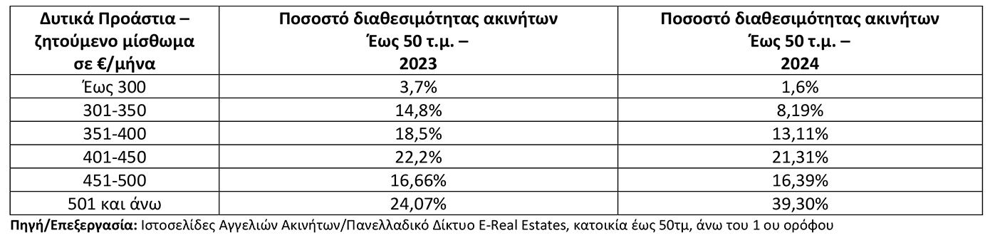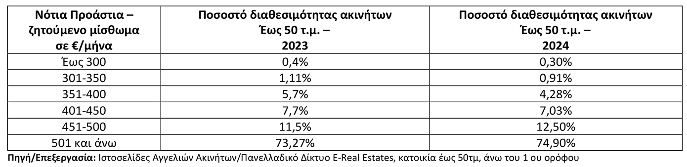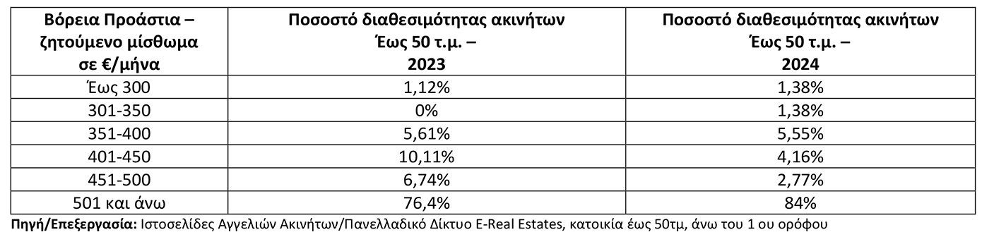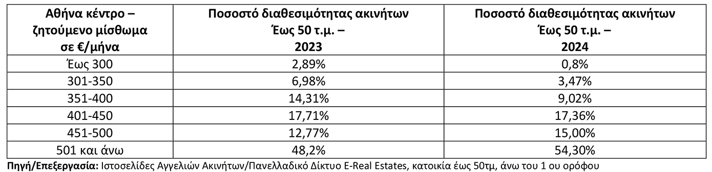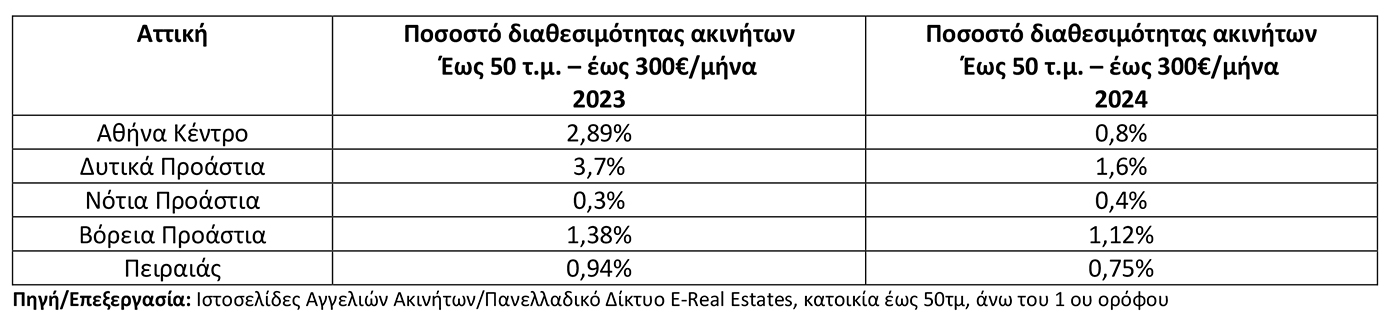 Συγκεκριμένα, στις περιοχές του κέντρου των Αθηνών, οι κατοικίες άνω του 1ου ορόφου έως 50τμ που διατίθενται με ζητούμενο μίσθωμα έως 300€, αποτελούν μόλις το 0,8% (2,89% το 2023, 12,47% το 2022) επί του συνόλου των διαθέσιμων προς μίσθωση κατοικιών άνω του 1ου ορόφου έως 50τμ.