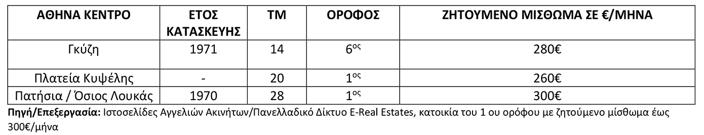Παραδείγματα κατοικιών με ζητούμενο μίσθωμα έως 300€/μήνα στις περιοχές του κέντρου της Αθήνας
