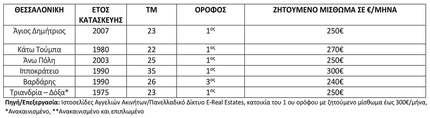 Σύμφωνα με τις αναρτημένες αγγελίες ακινήτων σε ιστοσελίδες, το μεγαλύτερο ποσοστό των διαθέσιμων φοιτητικών κατοικιών με ζητούμενο μίσθωμα έως 300€/μήνα, είναι ακίνητα έως 30τμ στις δημοφιλείς περιοχές της Θεσσαλονίκης. Ακίνητα που σε μεγάλο ποσοστό διατίθενται επιπλωμένα ή/και πλήρως ανακαινισμένα. Ακίνητα μεγαλύτερης επιφάνειας και σε πολλές περιπτώσεις νεότερα ηλικιακά, διατίθενται στη περιοχή του Βαρδάρη.