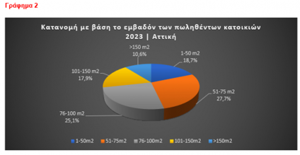 Στον νομό Αττικής, η εικόνα επιβεβαιώνει την παραπάνω τάση. Συγκεκριμένα, το 27,7% των αγοραστών προτίμησε ακίνητα εμβαδού από 51 έως 75 τετραγωνικά μέτρα, γεγονός που τα καθιστά τα πιο δημοφιλή στο σύνολο του νομού. Επίσης, 1 στους 4 αγοραστές προτίμησε ακίνητα εμβαδού από 76 έως 100 τετραγωνικά μέτρα, τα οποία εξακολουθούν να βρίσκονται σε υψηλή ζήτηση. Ακολουθούν σε αγοραστική δημοφιλία, με ποσοστό 18,7%, τα μικρότερα έως 50 τετραγωνικά μέτρα ακίνητα και πολύ κοντά βρίσκονται τα ακίνητα εμβαδού από 101 έως 150 τετραγωνικά μέτρα. Όσον αφορά στις πολύ μεγάλες κατοικίες (άνω των 151 τ.μ.), τις επέλεξαν μόλις 10 στους 100 αγοραστές.
