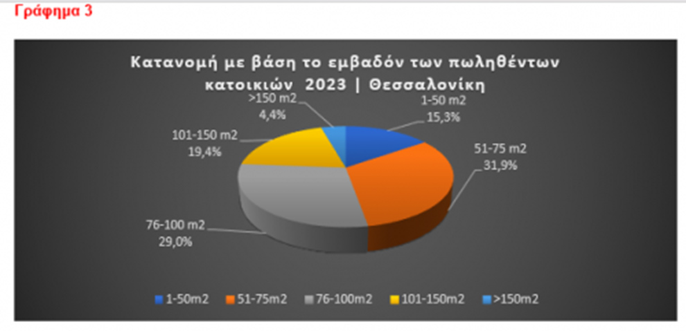 Στη Θεσσαλονίκη, παρατηρήθηκε αντίστοιχη εικόνα με αυτήν της Αττικής, με τους περισσότερους αγοραστές να επιλέγουν ακίνητα από 51 έως 75 τετραγωνικά μέτρα. Ακίνητα εμβαδού από 76 έως 100 τ.μ. επιλέχθηκαν σε μεγαλύτερο ποσοστό απ’ ότι εκείνα που είναι έως 50 τ.μ., και συγκεκριμένα κατά 29% και 15,3% αντίστοιχα. Τέλος, αξίζει να σημειωθεί ότι μεγαλύτερες κατοικίες, άνω των 151 τετραγωνικών μέτρων, προτιμήθηκαν σχεδόν κατά 50% λιγότερο σε σχέση με πέρυσι.
