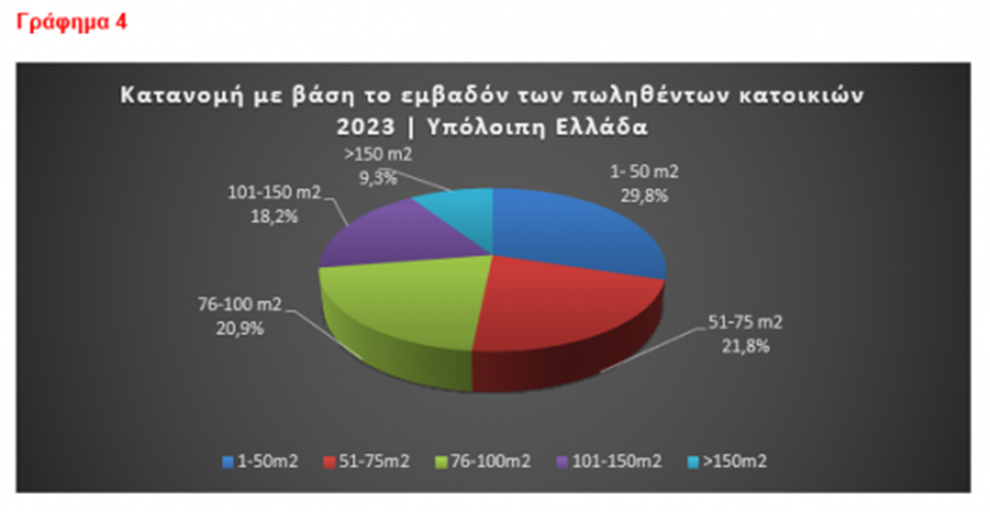 Στην υπόλοιπη Ελλάδα, παρατηρείται διαφορετική εικόνα σε σύγκριση με αυτήν της Αττικής και της Θεσσαλονίκης, με το 29,8% των αγοραστών να επιλέγει μικρότερα ακίνητα έως 50 τ.μ. και να παρατηρείται αύξηση κατά περίπου 35% σε σχέση με πέρυσι, καθιστώντας τη συγκεκριμένη κατηγορία την πιο δημοφιλή σε αυτές τις περιοχές. Ακολουθούν τα ακίνητα εμβαδού από 51 έως 75 τ.μ. σε ποσοστό 21,8%, ενώ το 20,9% των αγοραστών προτιμά ακίνητα από 76 έως 100 τετραγωνικά μέτρα. Τέλος, ακίνητα εμβαδού από 101 έως 150 τετραγωνικά μέτρα επιλέχθηκαν από το 18,2% των αγοραστών.