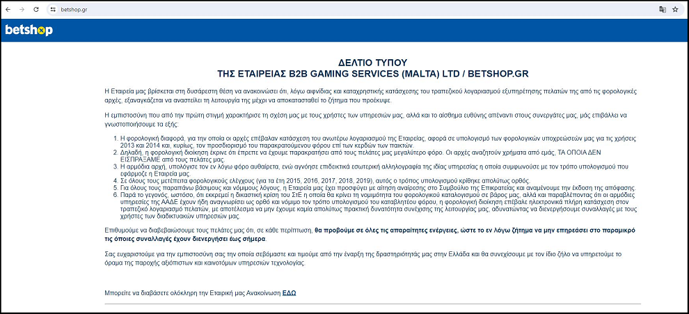 Στην αρχική σελίδα betshop.gr, εμφανίζεται μία ανακοίνωση, με την οποία η εταιρεία Β2Β GAMING Services (Malta) ενημερώνει, μεταξύ άλλων, ότι έχει προσφύγει με αίτηση αναίρεσης στο Συμβούλιο της Επικρατείας, διαβεβαιώνοντας τους πελάτες της ότι «θα προβεί σε όλες τις απαραίτητες ενέργειες, ώστε το εν λόγω ζήτημα να μην επηρεάσει στο παραμικρό τις όποιες συναλλαγές έχουν διενεργήσει έως σήμερα».