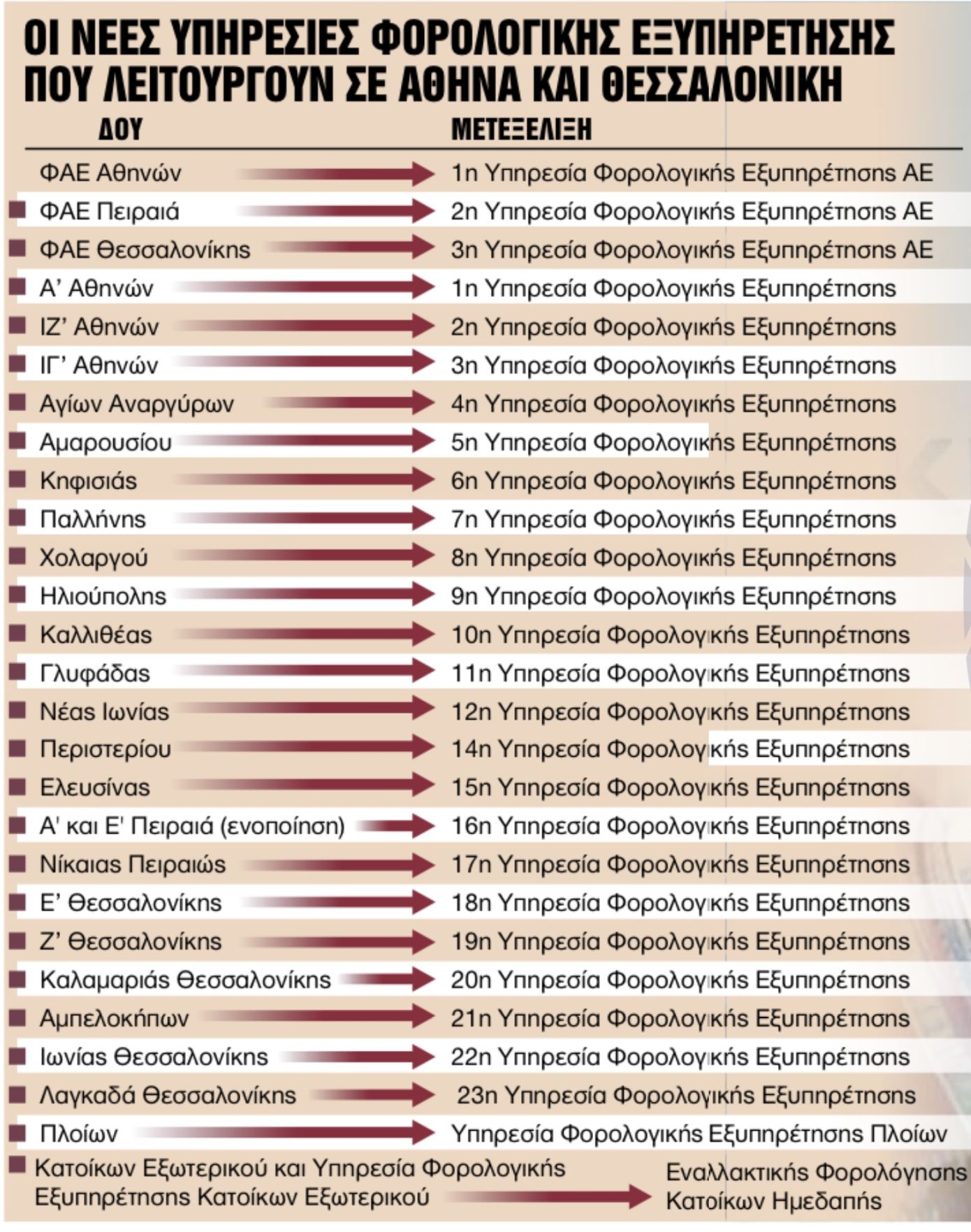 Ειδικότερα, όπως αναφέρουν σήμερα «Τα Νέα», με το νέο αυτό οργανωτικό σχήμα, οι γνωστές μας ΔΟΥ στο λεκανοπέδιο Αττικής και στη Θεσσαλονίκη είτε καταργούνται, είτε μετεξελίσσονται σε νέες, εξειδικευμένες υπηρεσίες. Συγκεκριμένα, μπαίνουν λουκέτο στις υπάρχουσες εφορίες και δημιουργούνται πλέον: