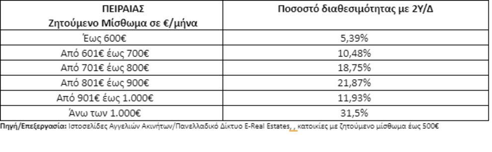 Σύμφωνα με ιστοσελίδες αγγελικών ακινήτων, στις περιοχές του Πειραιά, η διαθεσιμότητα είναι μηδενική για ακίνητα με ζητούμενο μίσθωμα έως 300 ευρώ. Μόλις 1 ακίνητα διατίθεται προς μίσθωση με ζητούμενο ενοίκιο έως 300 ευρώ. - Επιδότηση ενοικίου 500\ευρώ: 12 διαθέσιμα προς μίσθωση ακίνητα με 2 Υ/Δ