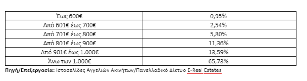 Σύμφωνα με τον κάτωθι πίνακα, το 87,4% (9 στα 10) των διαθέσιμων προς μίσθωση κατοικιών έχουν ζητούμενο μίσθωμα άνω των 800 ευρώ/μήνα.
