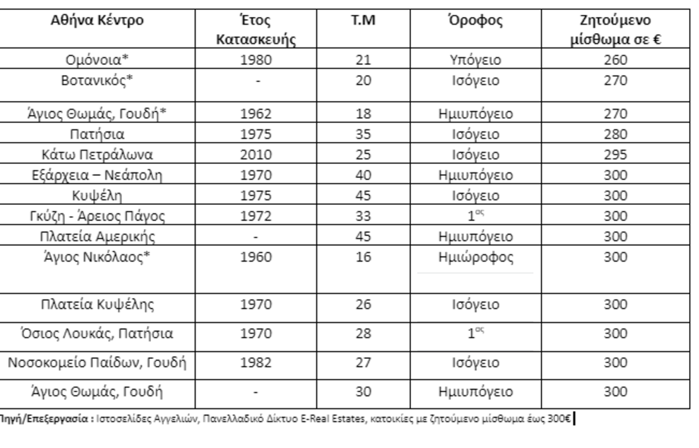Παραδείγματα κατοικιών με ζητούμενο μίσθωμα έως 300 ευρώ