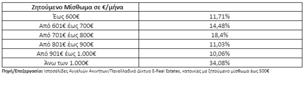 Σύμφωνα με τον κάτωθι πίνακα, το 79,85% (8 στα 10) των διαθέσιμων προς μίσθωση κατοικιών έχουν ζητούμενο μίσθωμα άνω των 800 ευρώ/μήνα.