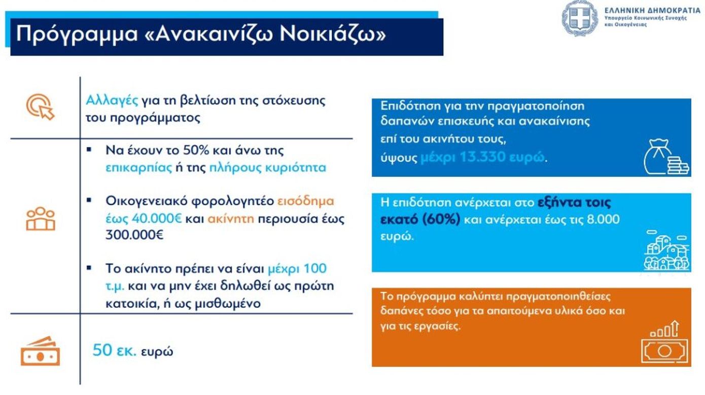 Σε λίγες μέρες θα έρθει η διάταξη για τη βελτίωση των όρων του Προγράμματος «Ανακαινίζω – Νοικιάζω». Η επιδότηση ανεβαίνει στο 60% και ανέρχεται έως τις 8.000 ευρώ για ανακαίνιση έως 13.330.