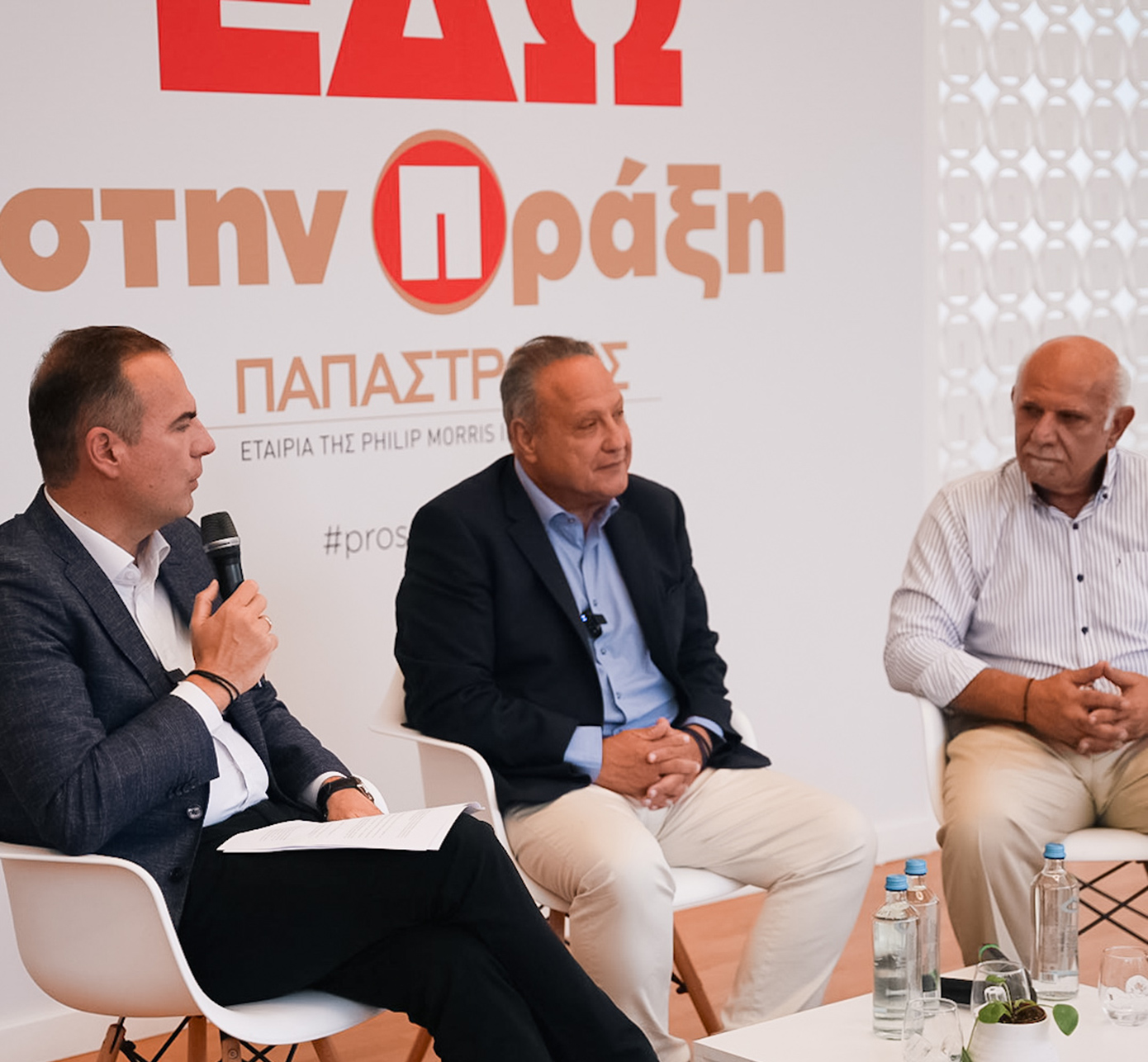 Στη συζήτηση συμμετείχαν ο Ιάκωβος Καργαρώτος, Αντιπρόεδρος της Παπαστράτος, ο Χρήστος Σταμάτης, Συνιδρυτής και Διευθύνων Σύμβουλος της Stevia Hellas, καθώς και ο Ηλίας Κάλφας, Project Leader του Innovation & Impact Hub της Αμερικανικής Γεωργικής Σχολής.