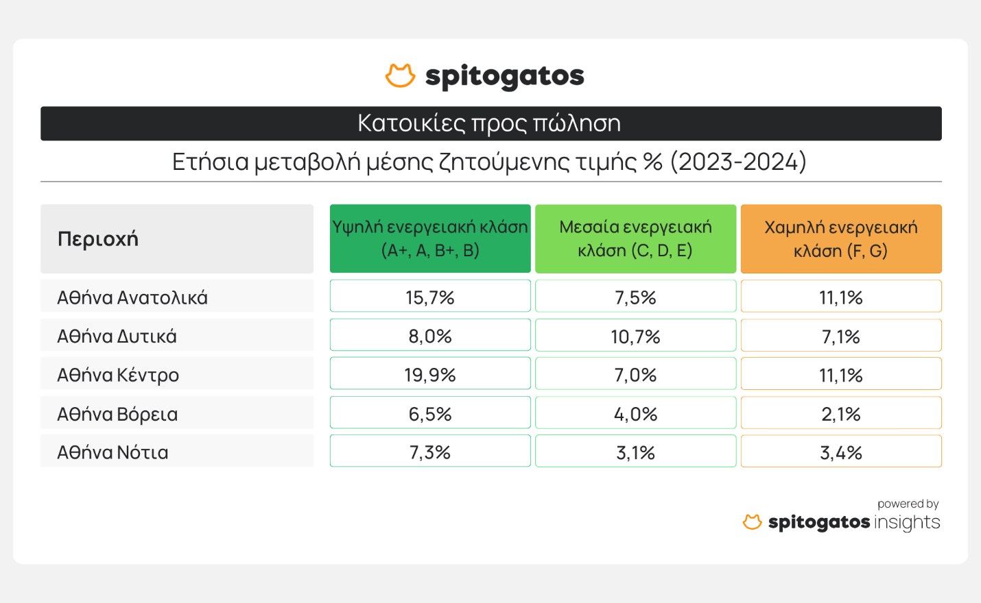 Στα Νότια Προάστια της Αθήνας συγκεντρώνεται πάνω από το 40% των διαθέσιμων προς πώληση κατοικιών υψηλής ενεργειακής κλάσης, ενώ ακολουθούν τα Βόρεια Προάστια και το κέντρο. Οι κατοικίες μεσαίας ενεργειακής κλάσης κατανέμονται πιο ομοιόμορφα σε Νότια, Βόρεια Προάστια και το κέντρο, με μικρότερες προσφορές στα Δυτικά και Ανατολικά Προάστια. Το 50% των κατοικιών χαμηλής ενεργειακής κλάσης βρίσκεται στο κέντρο της Αθήνας, ενώ ακολουθούν τα Νότια και Δυτικά Προάστια.