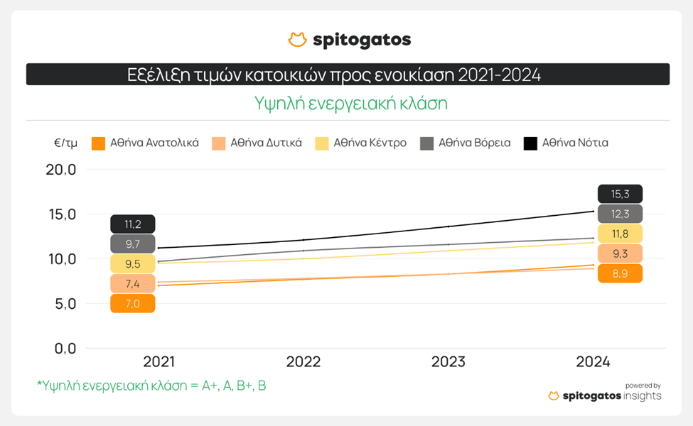 Τέλος, οι κατοικίες με χαμηλή ενεργειακή κλάση (F, G) παρουσιάζουν την υψηλότερη μέση ζητούμενη τιμή ενοικίασης στα Βόρεια Προάστια (10,9 ευρώ/τ.μ.), ενώ τα Δυτικά Προάστια παραμένουν η πιο οικονομική επιλογή (8,0 ευρώ/τ.μ.). Στα Ανατολικά Προάστια σημειώθηκε η μεγαλύτερη αύξηση στη μέση ζητούμενη τιμή ενοικίασης κατοικιών χαμηλής ενεργειακής κλάσης, με συνολική άνοδο 38,2% από το 2021 έως το 2024. Ειδικότερα, μόνο το διάστημα 2023-2024, η αύξηση ανήλθε στο 19,9%
