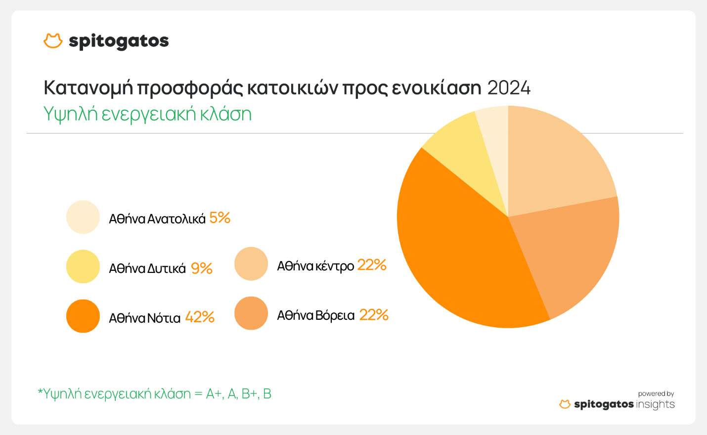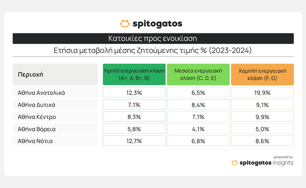 Για το 2024, τα Βόρεια και Νότια Προάστια της Αθήνας, μαζί με το κέντρο, συγκεντρώνουν πάνω από το 85% των διαθέσιμων κατοικιών προς ενοικίαση με υψηλή ενεργειακή κλάση (A+, A, B+, B), με τα Νότια Προάστια να κατέχουν άνω του 40%. Στις κατοικίες με μεσαία ενεργειακή κλάση, τα Νότια Προάστια διατηρούν την πρωτιά, ακολουθούμενα από το κέντρο της Αθήνας. Τέλος, το κέντρο της Αθήνας συγκεντρώνει πάνω από το 40% της προσφοράς κατοικιών χαμηλής ενεργειακής κλάσης (F και G).