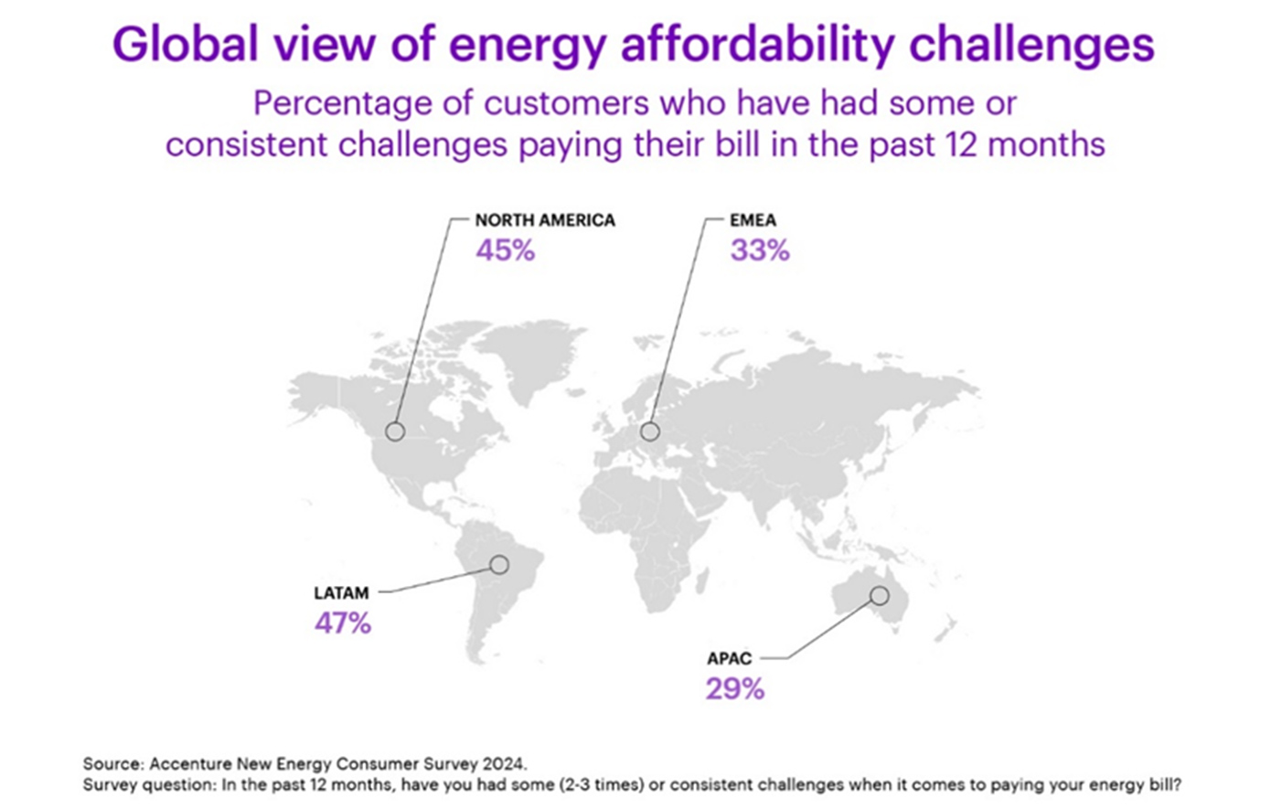 Η πρόκληση της οικονομικής προσιτότητας αποτελεί ένα παγκόσμιο φαινόμενο. Οι καταναλωτές σε όλες τις ηπείρους δυσκολεύονται σημαντικά στο να πληρώσουν τους λογαριασμούς ενέργειας -κυρίως στη Βόρεια Αμερική (45%) και τη Λατινική Αμερική (47%) σε σχέση με την περιοχή της EMEA (33%) και της Ασίας (29%).