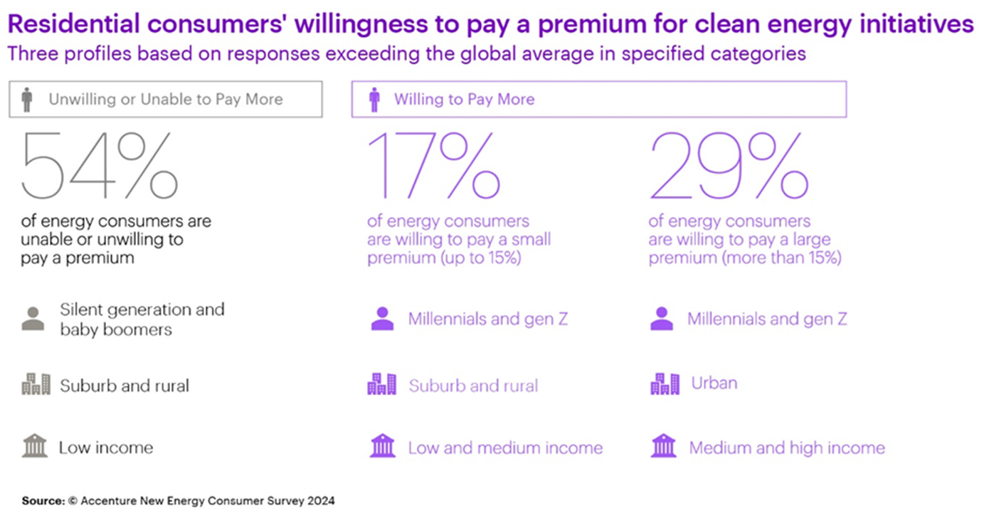 Ωστόσο, δεν αποτελεί έκπληξη, δεδομένων των τρεχουσών οικονομικών συνθηκών, ότι οι περισσότεροι ερωτηθέντες στην έρευνα είναι επιφυλακτικοί στο να επωμιστούν το κόστος για τη μετάβαση σε καθαρή ενέργεια. Συγκριμένα, 54% των ερωτηθέντων ανέφερε ότι δεν επιθυμεί ή δεν μπορεί να υποστηρίξει την καταβολή ενός premium καθαρής ενέργειας, με 48% να αναφέρει την οικονομική προσιτότητα της ενέργειας ως κύρια αιτία. Εξαίρεση αποτελεί το 29% του δείγματος, κυρίως νέοι, αστικοί καταναλωτές, που ήταν πρόθυμοι να πληρώσουν ένα premium άνω του 15%.
