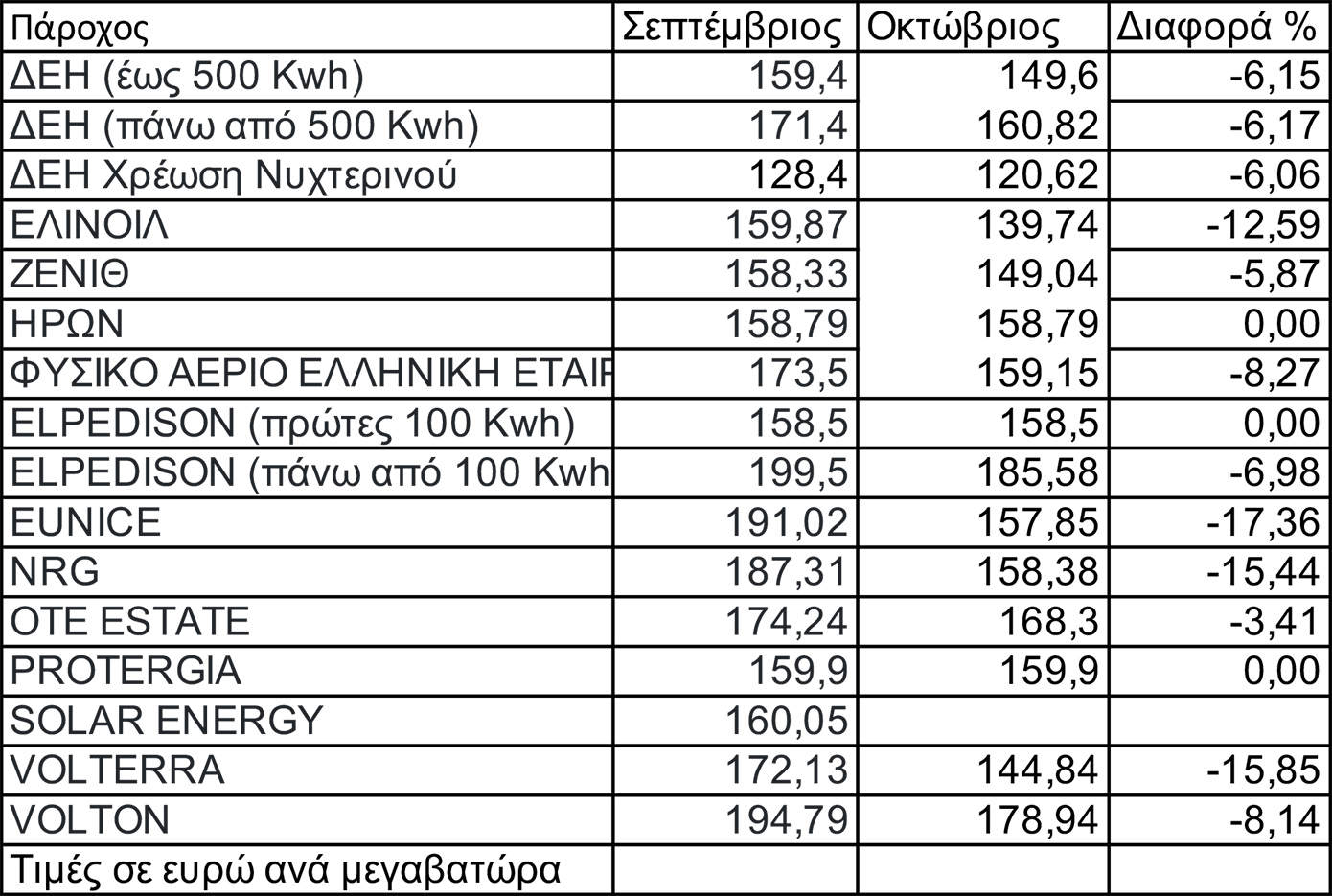 Οι μειώσεις αντανακλούν την υποχώρηση της μέσης τιμής της ηλεκτρικής ενέργειας το Σεπτέμβριο που διαμορφώθηκε στα 112,35 ευρώ ανά μεγαβατώρα έναντι 129,83 ευρώ τον Αύγουστο.