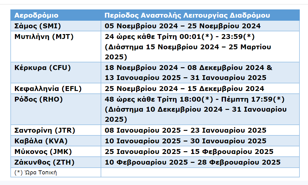 Συγκεκριμένα, οι ημερομηνίες αναστολής λειτουργίας των διαδρόμων ανά αεροδρόμιο, σύμφωνα με ανακοίνωση της εταιρείας κατά τις οποίες θα διακοπούν προσωρινά όλες οι εμπορικές και ιδιωτικές πτήσεις, είναι: