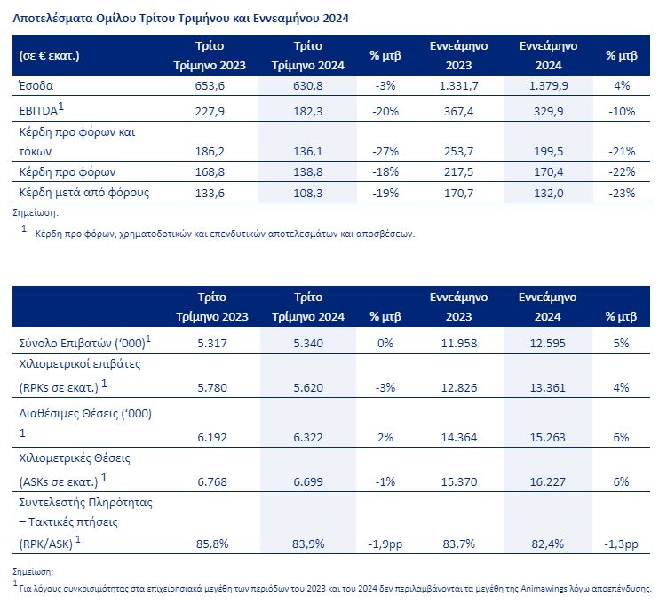 Τα αποτελέσματα του εννεαμήνου, όπως αναφέρει η διοίκηση, συνιστούν την υψηλότερη ιστορικά επίδοση σε επίπεδα επιβατικής κίνησης και Κύκλου Εργασιών για την εταιρεία αλλά και τη δεύτερη ιστορικά υψηλότερη επίδοση σε κερδοφορία παρά τους σημαντικούς περιορισμούς που παρουσιάστηκαν. Ειδικότερα, όπως επισημαίνεται σχετικά, η ανάγκη πρόωρων ελέγχων στους κινητήρες GTF της Pratt & Whitney που καθήλωσε έως και 10 νέα αεροσκάφη (ήτοι το 17% των Jets), περιόρισε τη δυνατότητα ανάπτυξης αλλά και την ωφέλεια κόστους (καύσιμα/συντήρηση/αριθμός θέσεων ανά πτήση) από τη χρήση τους. Επιπλέον, η αναστολή από το τέλος Ιουλίου λόγω της γεωπολιτικής κρίσης της σύνδεσης με Τελ Αβίβ και Βηρυτό (έως 11 πτήσεις καθημερινά από Αθήνα, Θεσσαλονίκη, Ηράκλειο, Ρόδο και Λάρνακα) προκάλεσε απώλεια 3,5-4,0% της κίνησης εξωτερικού κατά το 3ο τρίμηνο.
