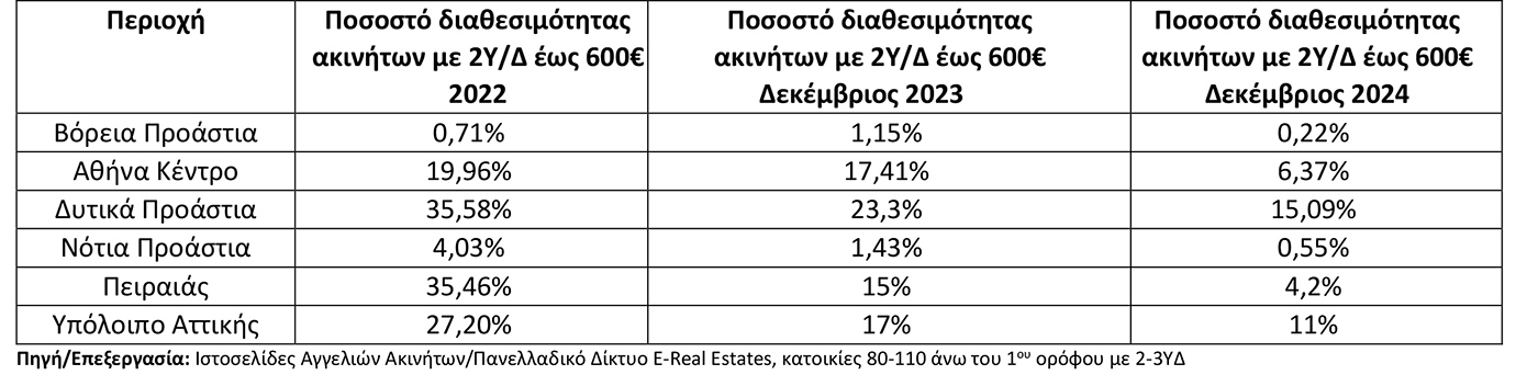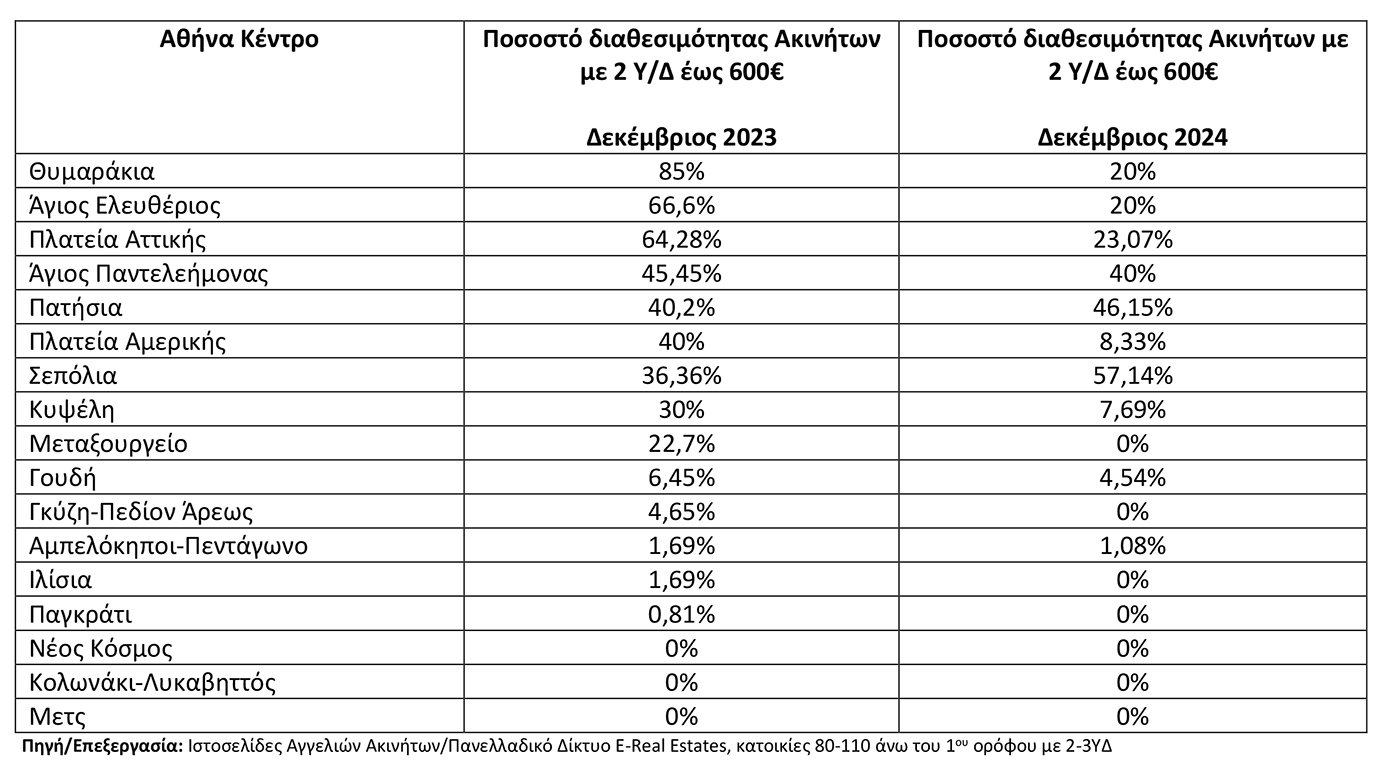 Σύμφωνα με τον κάτωθι πίνακα, καταγράφεται ραγδαία μείωση της διαθεσιμότητας κατοικιών (80-110τμ, άνω του 1ου ορόφου) με ζητούμενο μίσθωμα έως 600€, ακόμη και στις άλλοτε οικονομικές περιοχές. Συγκεκριμένα, στην περιοχή Θυμαράκια, το 2023, το ποσοστό διαθεσιμότητας κατοικιών με ζητούμενο μίσθωμα έως 600€ ήταν 85%, σήμερα δεν ξεπερνά το 20%. Η ίδια εικόνα καταγράφεται και στις περιοχές όπως, ο Άγιος Ελευθέριος, Πλατεία Αττικής, Πλατεία Αμερικής και στη Κυψέλη. Οι περιοχές του κέντρου που καταγράφουν τη μεγαλύτερη διαθεσιμότητα οικονομικών κατοικιών είναι τα Πατήσια, ο Άγιος Παντελεήμονας και τα Σεπόλια.