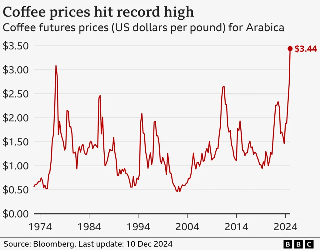 Το τελευταίο υψηλό ρεκόρ για την τιμή του καφέ σημειώθηκε το 1977 μετά τις ασυνήθιστες χιονοπτώσεις που κατέστρεψαν τις φυτείες στη Βραζιλία. «Οι ανησυχίες για τη σοδειά του 2025 στη Βραζιλία είναι ο κύριος οδηγός», δήλωσε ο Ole Hansen, επικεφαλής της στρατηγικής εμπορευμάτων της Saxo Bank. «Η χώρα βίωσε τη χειρότερη ξηρασία των τελευταίων 70 ετών κατά τη διάρκεια του Αυγούστου και του Σεπτεμβρίου, ακολουθούμενη από έντονες βροχοπτώσεις τον Οκτώβριο, αυξάνοντας τους φόβους ότι η σοδειά θα μπορούσε να καταστραφεί».