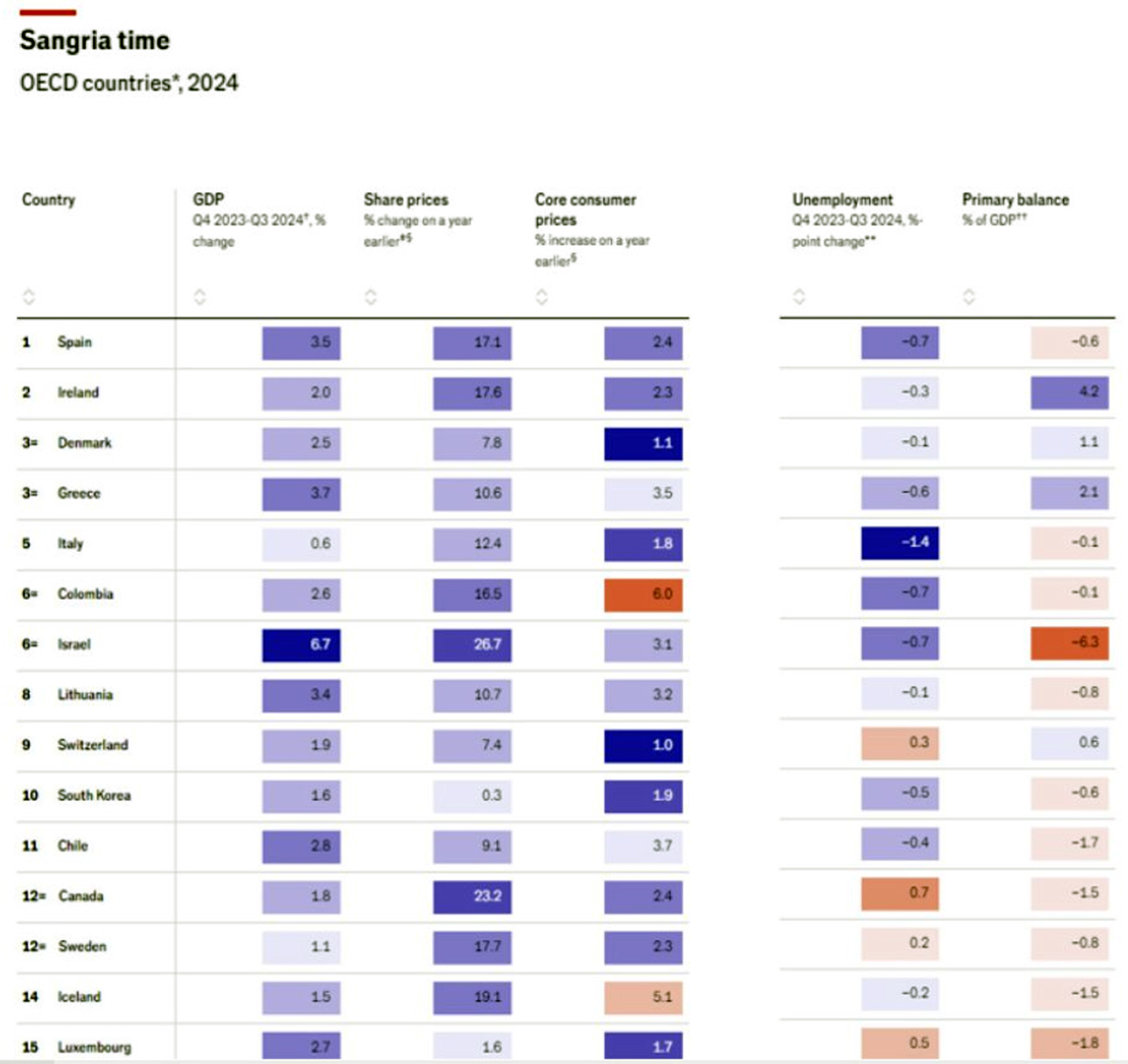 Για τρίτη συνεχόμενη χρονιά, οι χώρες της Μεσογείου συνεχίζουν το ράλι στις οικονομίες, αναφέρει ο Economist, σε άρθρο με τίτλο «Ποια οικονομία τα πήγε καλύτερα το 2024;» κάνοντας τον απολογισμό των επιδόσεων διεθνώς. Στην κορυφή της λίστας με τις οικονομίες που είχαν εξαιρετικά αποτελέσματα φέτος βρίσκεται η Ισπανία, ενώ στην πεντάδα βρίσκονται επίσης η Ελλάδα και η Ιταλία, που συνεχίζουν την ισχυρή τους πορεία.