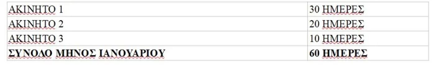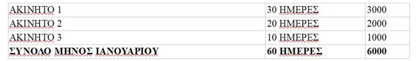 Έστω φυσικό πρόσωπο με τρεις (3) ΑΜΑ (άρα με έναρξη επιχειρηματικής), όπου στον μήνα Ιανουάριο είχε σύνολο ημερών Βραχυχρόνιας Μίσθωσης ως κάτωθι: