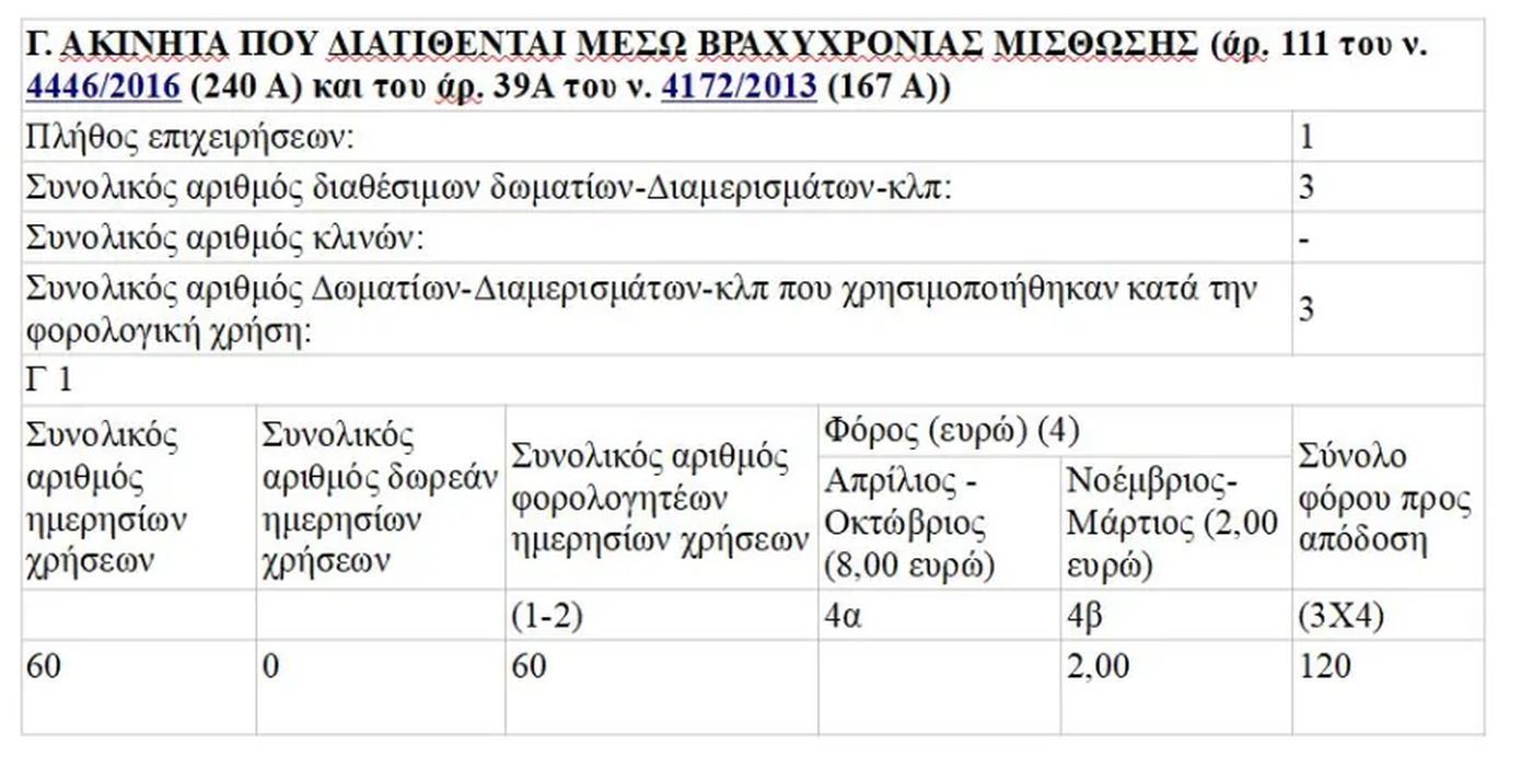 • Α2. Φυσικά Πρόσωπα με Βραχυχρόνια Μίσθωση τριών (3) ακίνητων και άνω (μόνη παροχή τα κλινοσκεπάσματα και διάρκεια κάθε μίσθωσης έως και 59 ημέρες):