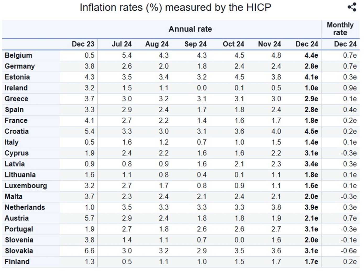 Τον Δεκέμβριο, τα υψηλότερα επίπεδα πληθωρισμού στην ευρωζώνη καταγράφουν η Κροατία (4,5%), το Βέλγιο (4,4%), η Εσθονία (4,1%) και η Ολλανδία (3,9%).