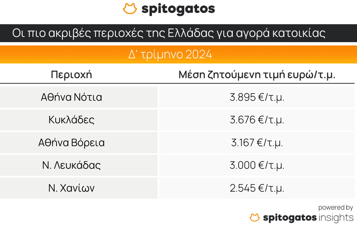 Σύμφωνα με τα δεδομένα, τα Νότια Προάστια της Αττικής διατηρούν την πρωτοκαθεδρία ως η ακριβότερη περιοχή για αγορά κατοικίας, με τις Κυκλάδες να ακολουθούν στη δεύτερη θέση. Στην τρίτη θέση βρίσκονται τα Βόρεια Προάστια της Αθήνας, ενώ σημαντική άνοδο σημείωσε ο Νομός Λευκάδας. Ενδιαφέρον παρουσιάζει η εμφάνιση του Νομού Χανίων στην πεντάδα των ακριβότερων περιοχών, γεγονός που αποδίδεται στην αυξανόμενη ζήτηση για τουριστικά ακίνητα και στην ανάπτυξη της περιοχής.