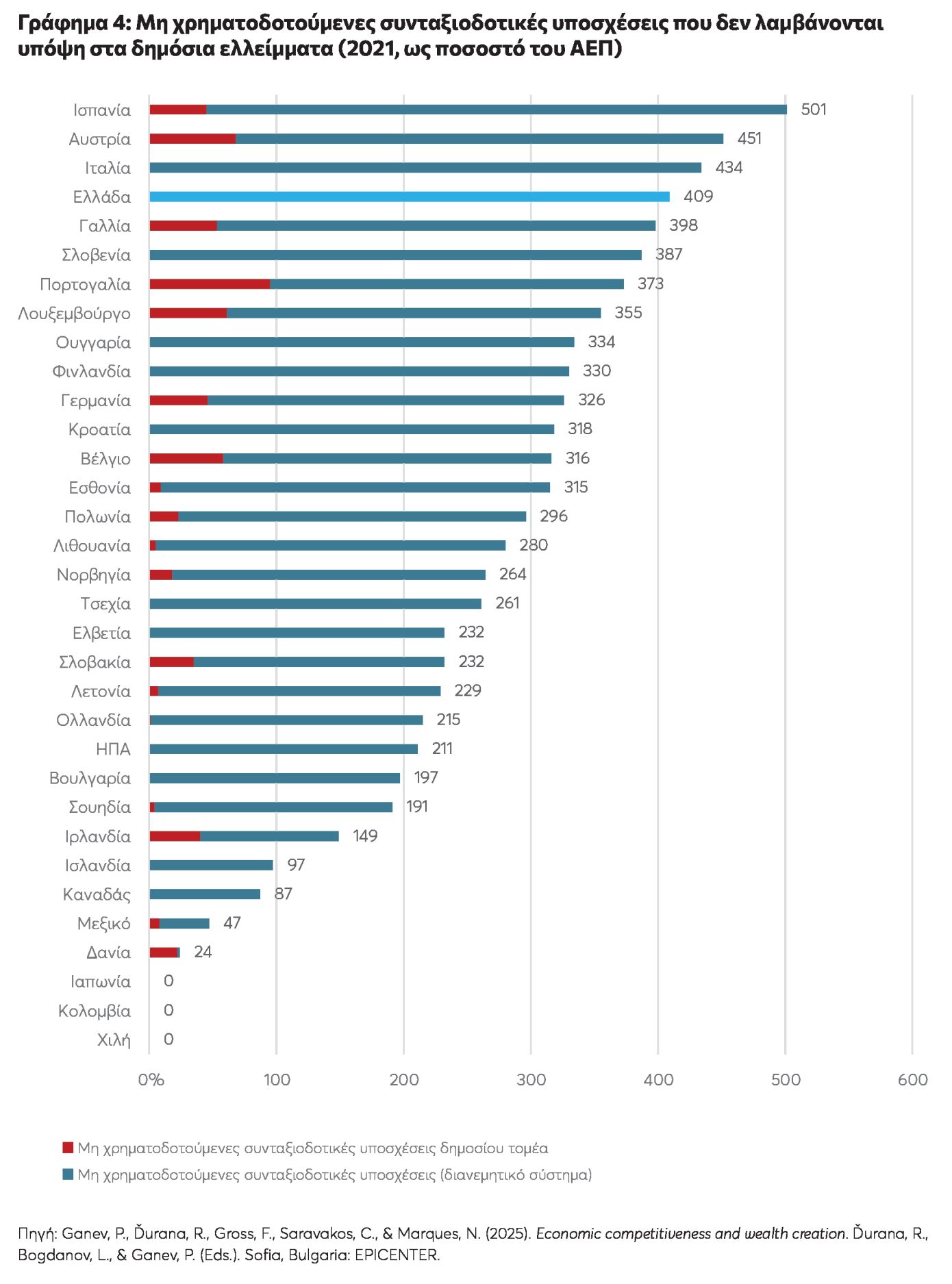 Ταυτόχρονα, η μη συμπερίληψη των σιωπηρών χρεών από συνταξιοδοτικές υποσχέσεις στο κριτήριο του χρέους του Μάαστριχτ εμποδίζει την αναγκαία μετάβαση σε ένα ισχυρό κεφαλαιοποιητικό σύστημα, τόσο στην Ελλάδα όσο και σε άλλες ευρωπαϊκές χώρες.
