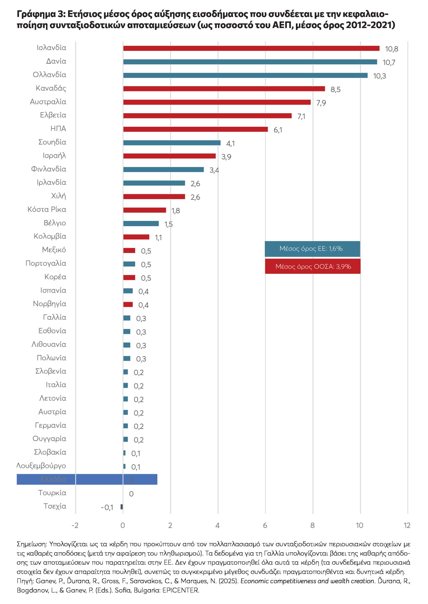 - Ο πλούτος που δημιουργήθηκε από την κεφαλαιοποίηση συνταξιοδοτικών αποταμιεύσεων στην Ισλανδία και τη Δανία την περίοδο 2012-2021 ανέρχεται σε 11% του ΑΕΠ, ενώ στην Ελλάδα είναι μηδενικό.