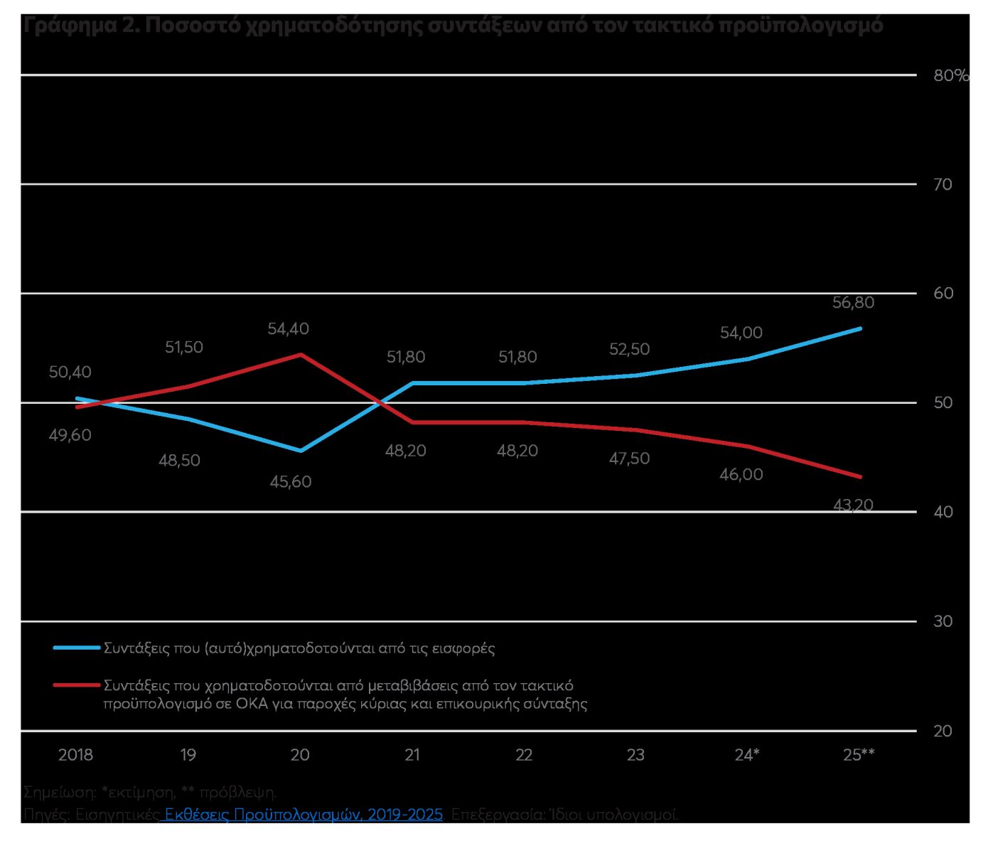 - Σύμφωνα με τα στοιχεία των εισηγητικών εκθέσεων των προϋπολογισμών για την περίοδο 2018-2025, το 2018, η μισή δαπάνη για συντάξεις χρηματοδοτήθηκε από τον τακτικό προϋπολογισμό (γενική φορολογία), ενώ μόνο το υπόλοιπο 50% προήλθε από εισφορές. Το 2025, η χρηματοδότηση για συντάξεις από τον τακτικό προϋπολογισμό αναμένεται να φτάσει το 43%.
