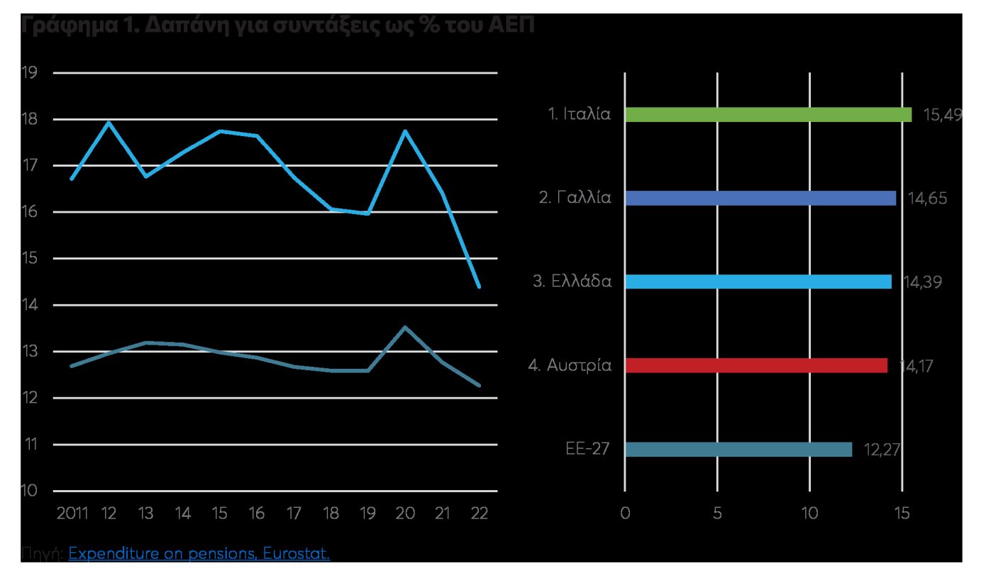 - Παρά τις σημαντικές μεταρρυθμίσεις της τελευταίας δεκαετίας και την πτωτική τάση της κρατικής δαπάνης για συντάξεις, η Ελλάδα εξακολουθεί να έχει την τρίτη μεγαλύτερη δαπάνη για συντάξεις ως ποσοστό του ΑΕΠ στην ΕΕ, αποκλίνοντας κατά 2,12 ποσοστιαίες μονάδες από τον μέσο όρο των 27 κρατών μελών.