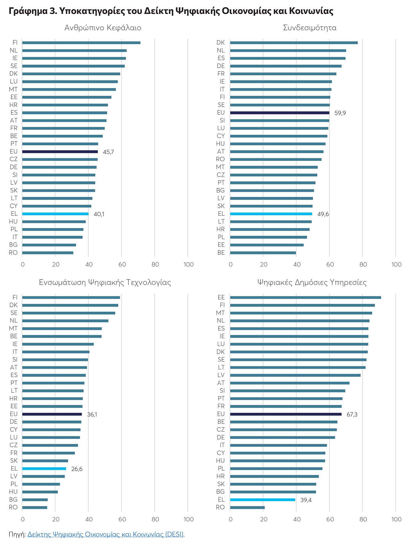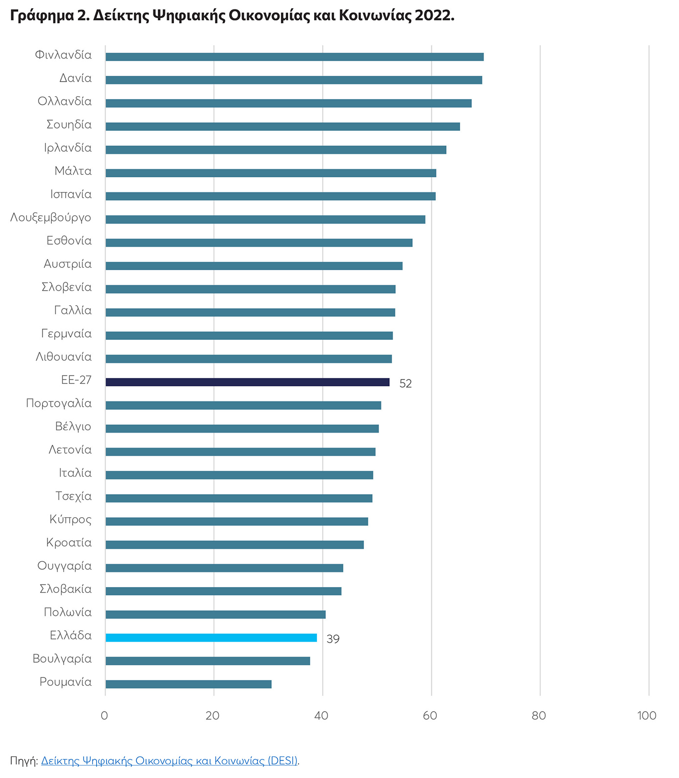 - Η Ελλάδα κατέχει την 25η θέση στον Δείκτη Ψηφιακής Οικονομίας και Κοινωνίας (DESI) για το 2022 στην ΕΕ.