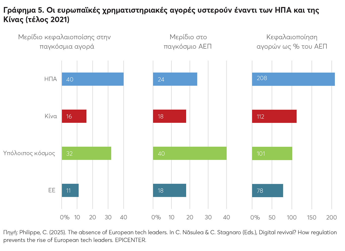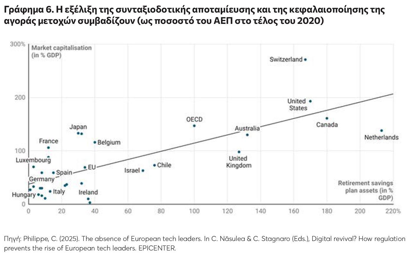 Η μελέτη τονίζει ότι η έλλειψη ανεπτυγμένων κεφαλαιαγορών και ιδιωτικών χρηματοδοτικών εργαλείων αποτελεί έναν από τους κύριους λόγους για την καθυστέρηση της ΕΕ και, ιδιαίτερα, της Ελλάδας σε σχέση με τις ΗΠΑ στους τομείς της τεχνολογίας και της καινοτομίας. Οι συνδυασμένες επιπτώσεις της γραφειοκρατίας, των υψηλών φορολογικών συντελεστών και των περιορισμένων χρηματοδοτικών δυνατοτήτων δυσκολεύουν την ανάπτυξη καινοτόμων επιχειρήσεων, επηρεάζοντας αρνητικά την οικονομική προοπτική της χώρας.