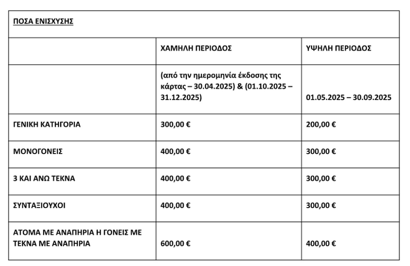- ανάλωση του ποσού εφάπαξ ή τμηματικά ανάλογα με την περίοδο που έχει επιλέξει ο κάθε δικαιούχος (30.09.2025 για την υψηλή περίοδο, 31.12.2025 για την υψηλή περίοδο), ώστε να υποστηριχθεί.