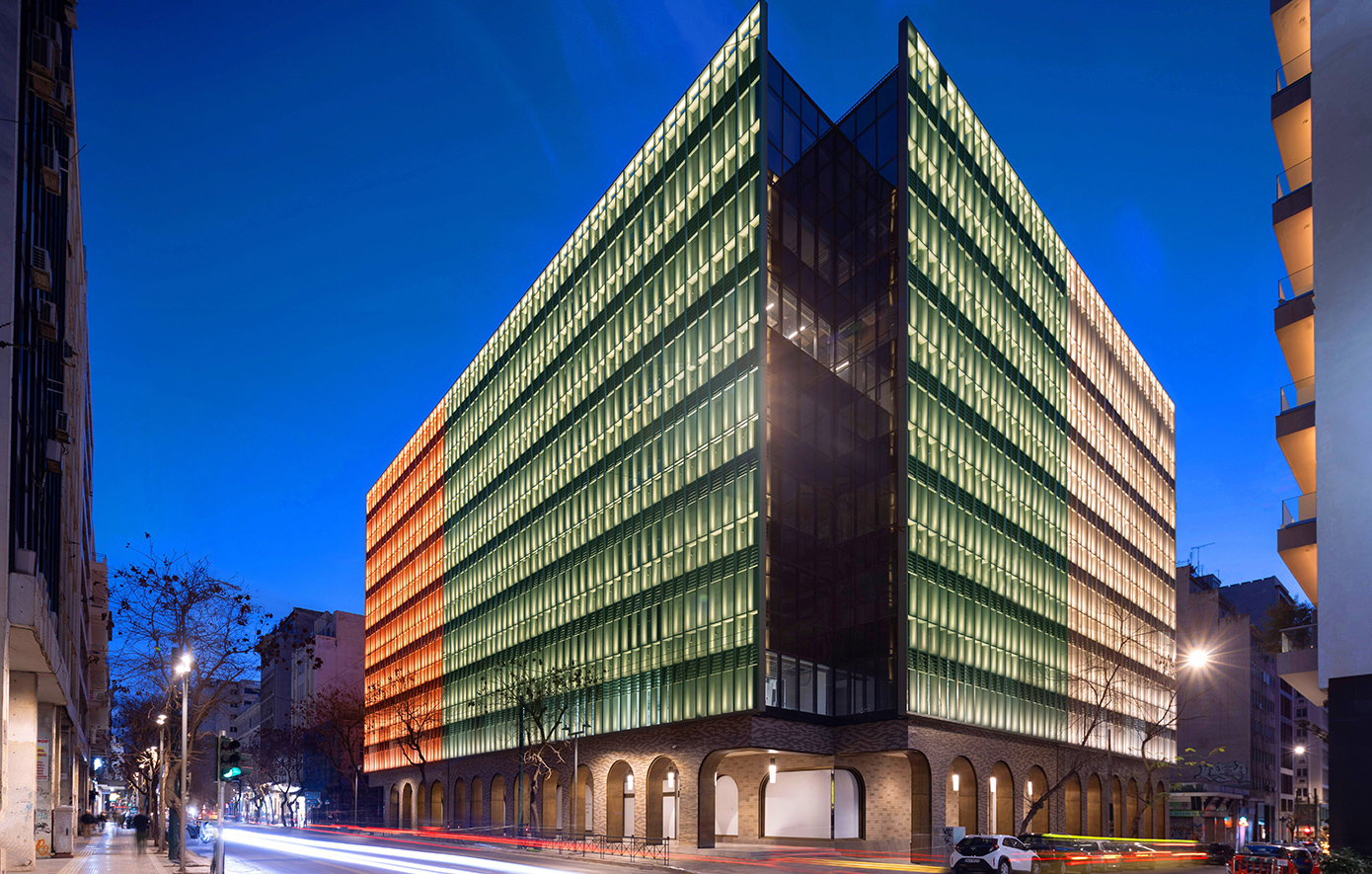 Ένα από τα μεγαλύτερα επιτεύγματα του έργου είναι η ανακύκλωση της παλιάς όψης του κτηρίου. Πάνω από 126 τόνοι γυαλιού αποξηλώθηκαν, στάλθηκαν για επεξεργασία ανακύκλωσης και επανήλθαν ως νέο υλικό στη νέα όψη, συμβάλλοντας στη μείωση του ανθρακικού αποτυπώματος. Παράλληλα, εγκαταστήσαμε ένα σύγχρονο φωτοβολταϊκό σύστημα 500 τ.μ., το οποίο παράγει καθαρή ενέργεια για τις ανάγκες του κτηρίου, ενώ η νέα του όψη είναι σχεδιασμένη έτσι ώστε να μειώνει την ηλιακή ακτινοβολία κατά 45%, μειώνοντας αντίστοιχα τα ψυκτικά φορτία κατά 20%.