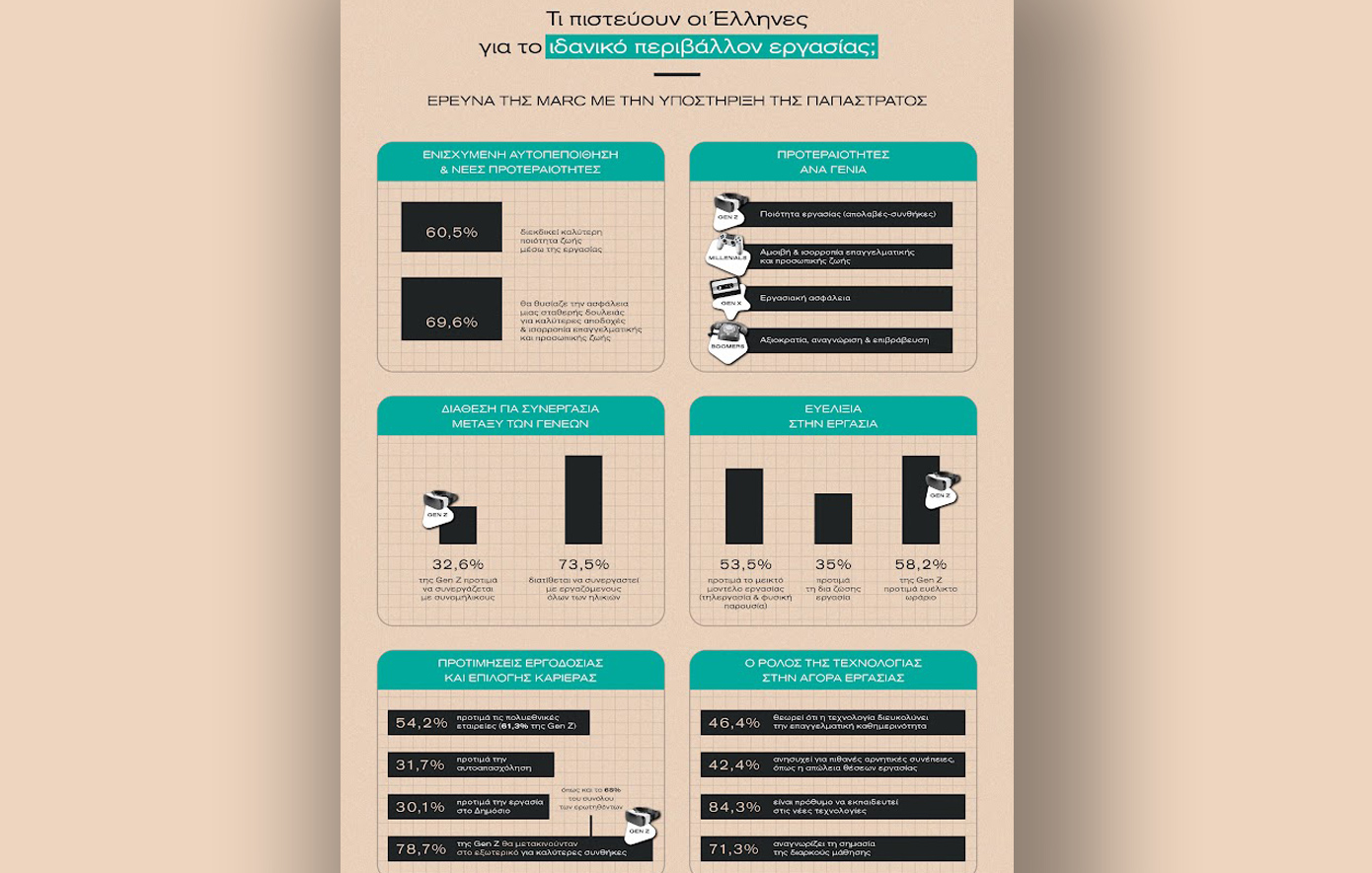 Η νέα, μεγάλη έρευνα της MARC για την Παπαστράτος, που πραγματοποιήθηκε σε 1.053 άτομα ηλικίας 18-65 ετών, αποκαλύπτει ένα ενδιαφέρον μοτίβο: οι διαφορετικές γενιές έχουν ξεκάθαρα διαφορετικές προσδοκίες από την εργασία τους. Οι νεότεροι κυνηγούν ευκαιρίες και ελευθερία κινήσεων, ενώ οι μεγαλύτεροι αναζητούν αναγνώριση και σταθερότητα. Το εργασιακό τοπίο αλλάζει – και μαζί του αλλάζουν και οι κανόνες του παιχνιδιού.