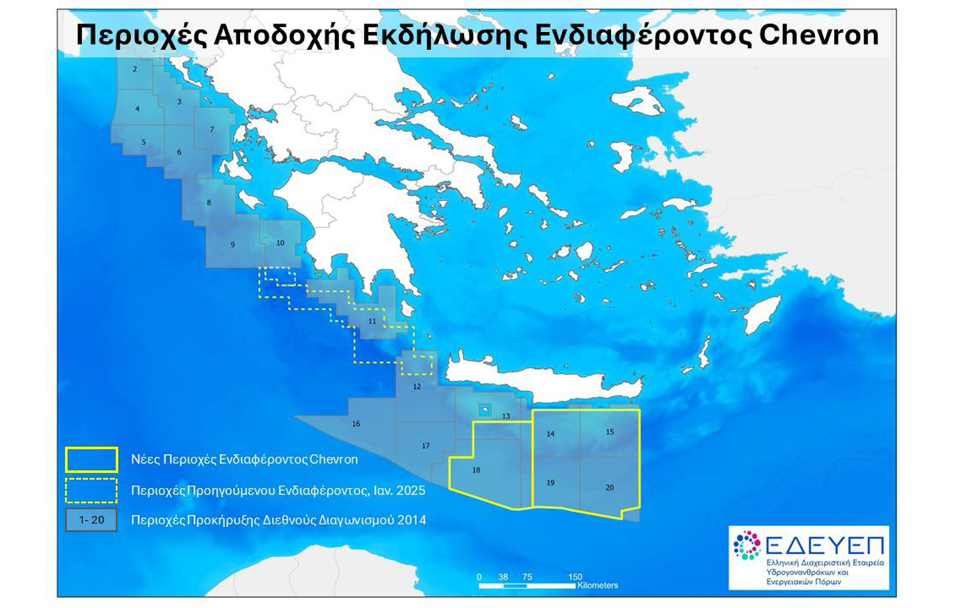 Όπως αναφέρεται στη σχετική ενημέρωση, «επιβεβαιώνεται, σήμερα, το συνεχιζόμενο επενδυτικό ενδιαφέρον της Chevron για την Ελλάδα, που αφορά την εξερεύνηση πιθανών κοιτασμάτων φυσικού αερίου. Συγκεκριμένα, η ελληνική Κυβέρνηση αποδέχθηκε την εκδήλωση ενδιαφέροντος για τις περιοχές Νότια της Κρήτης Ι και Νότια της Κρήτης ΙΙ, εντός των περιοχών που είχαν οριοθετηθεί με την προκήρυξη του διεθνούς διαγωνισμού το 2014. Θα ακολουθήσουν από το Υπουργείο Περιβάλλοντος και Ενέργειας οι σχετικές υπουργικές αποφάσεις, αποδοχής του αιτήματος, προσδιορισμού των γεωγραφικών περιοχών, επιλογής του τύπου της σύμβασης και έγκρισης του κειμένου της προκήρυξης του διαγωνισμού.