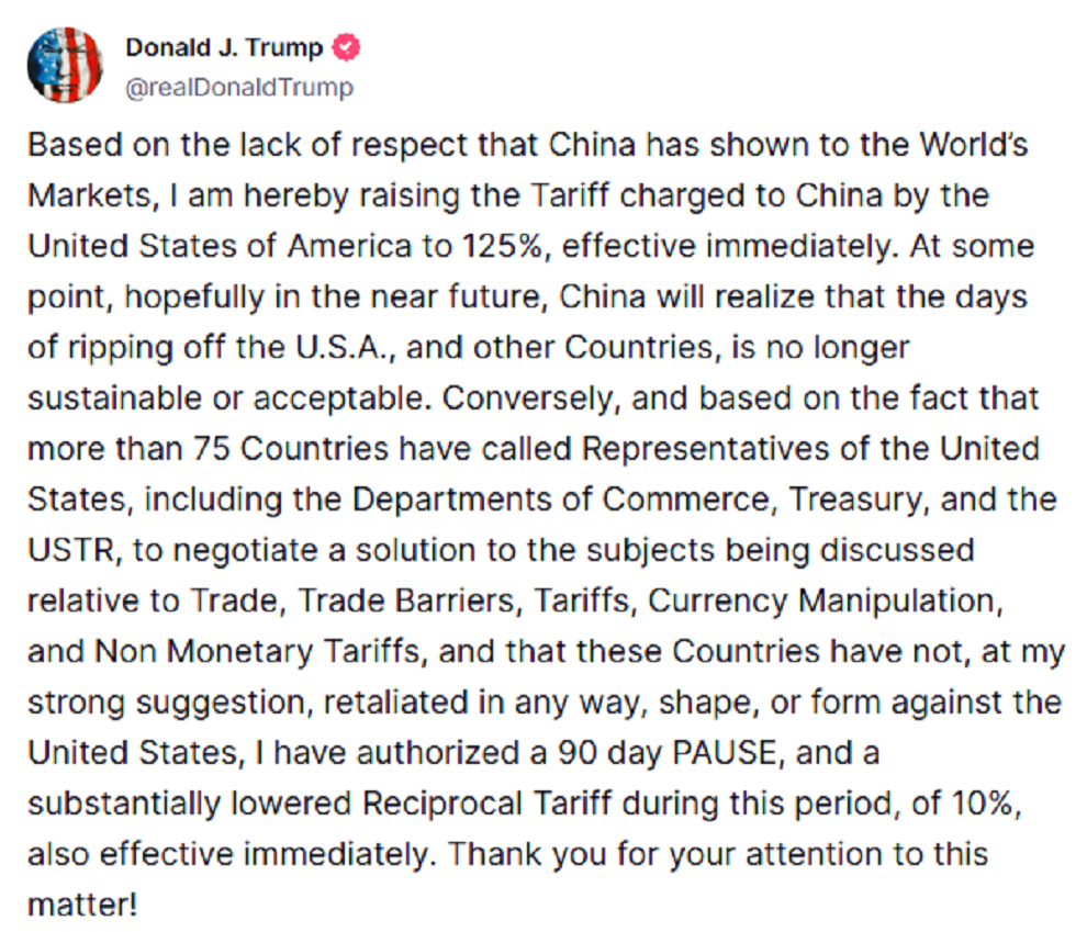 «Λόγω της έλλειψης σεβασμού της Κίνας απέναντι στις διεθνείς αγορές (…) αυξάνω τους δασμούς στην Κίνα στο 125%», έγραψε. «Ταυτόχρονα, λόγω της προθυμίας περισσότερων από 75 χωρών να διαπραγματευτούν, ενέκρινα την αναστολή για 90 ημέρες των ανταποδοτικών δασμών που θα μειωθούν σημαντικά κατά την περίοδο αυτή, στο 10% και θα τεθούν άμεσα σε ισχύ» και για τις άλλες χώρες.