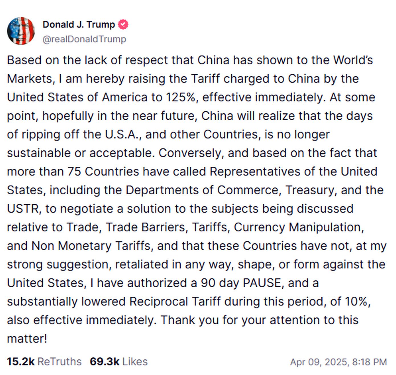 «Λόγω της έλλειψης σεβασμού της Κίνας απέναντι στις διεθνείς αγορές (…) αυξάνω τους δασμούς στην Κίνα στο 125%», έγραψε. «Ταυτόχρονα, λόγω της προθυμίας περισσότερων από 75 χωρών να διαπραγματευτούν, ενέκρινα την αναστολή για 90 ημέρες των ανταποδοτικών δασμών που θα μειωθούν σημαντικά κατά την περίοδο αυτή, στο 10% και θα τεθούν άμεσα σε ισχύ και για τις άλλες χώρες».