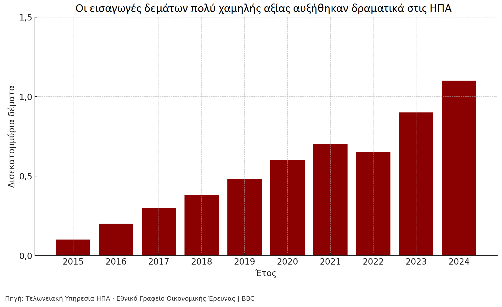 Οι αρχές των ΗΠΑ θεωρούν επίσης ότι η επιτυχία πλατφορμών όπως η Temu και η Shein προκαλεί πίεση στις τελωνειακές υπηρεσίες, αφού οι αποστολές μέσω της εξαίρεσης αυξήθηκαν από περίπου 140 εκατομμύρια πριν μια δεκαετία σε πάνω από ένα δισεκατομμύριο το 2023.