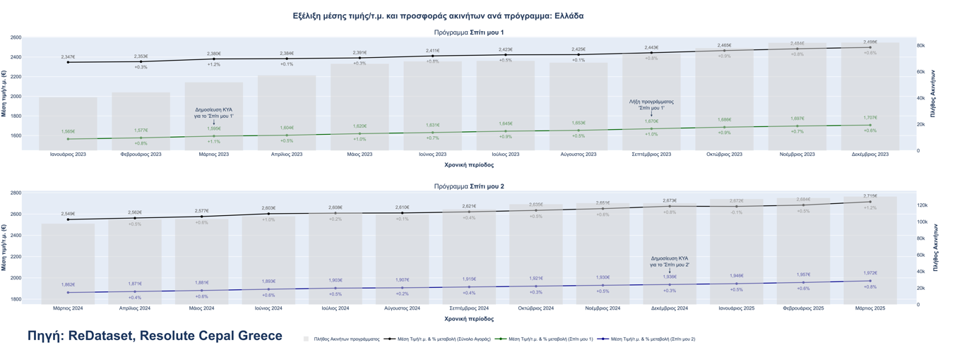 Συγκρατημένη αύξηση στις τιμές των ακινήτων και περιορισμένη ενίσχυση της προσφοράς καταγράφονται στο πρώτο τετράμηνο εφαρμογής του προγράμματος «Σπίτι μου 2», σύμφωνα με την τελευταία ανάλυση του τμήματος ReDataset της Resolute Cepal Greece (RCG).